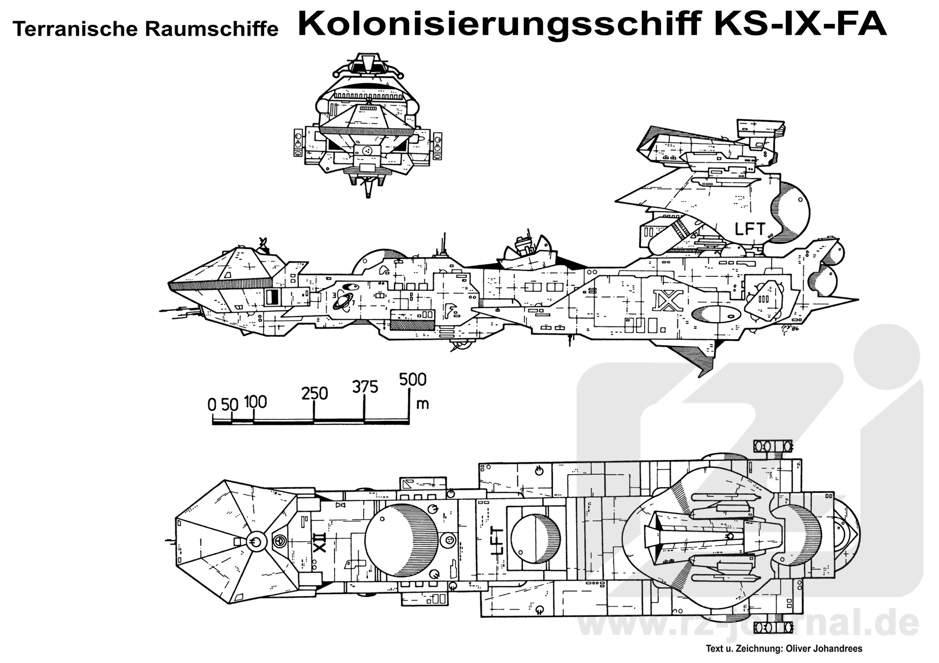 Wo größere Umsiedlungsaktionen erfolgten, brachen bis zu fünf Kolonisierungsschiffe des KS-IX-FA-Typs zugleich auf, um im ungünstigsten Fall auch ohne Kontakt zu Terra das Überleben der Auswanderer in ihrer neuen Umgebung zu garantieren. Es wurden insgesamt 182 solcher Schiffe gebaut. Das hier dargestellte befindet sich in der Sammlung eines Veteranenliebhabers, der es aus einer Laune heraus mit der Aufschrift LFT versehen ließ. In seinen Ausstellungshallen ist es noch im Jahr 428 NGZ zu bewundern. Technische Daten: Länge über alles: 1775 Meter Breite: 490 Meter Höhe: 680 Meter Ruhende Masse: 20,03 Millionen Tonnen Beschleunigung: 710,00 km/sec² Besatzung: a) Stammbesatzung: 932 Mann
