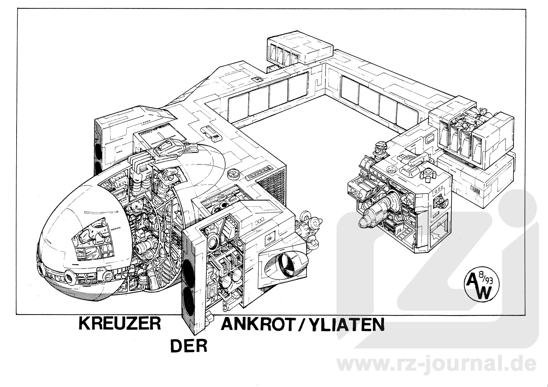 Allgemeines: Yliaten und Ankrot sind die vorherrschenden Völker in der Galaxis Novhonnai, verbunden durch eine überaus enge Allianz, hie Schiffe beider Völker sind standardmäßig kompatibel konzeptioniert. Allen gemeinsam ist der zentrale quadratische Modulschacht von ca. 22G mal 220 Meter. Hier können verschiedene Module verankert werden, denen nur die genannte Grundfläche gemeinsam ist. Es gibt z.B. auch Großcontainer mit einer Höhe von ca. 4.000 Metern. Fünf der gezeigten Schiffe können sich in gleichen Abständen daran anklinken. Optisch entsteht dann das Bild eines hohen Quaders mit fünf Ringen. Kampfkraft und technischer Standard des gezeigten Schiffes entspricht etwa einem terranischen Vesta-Kreuzer der neueren NGZ-Jahre. Wegen der energetischen Besonderheiten in der Galaxis fliegen die Ankrotischen und Yiiatischen Schiffe außer mit einem Metagrav- ähnlichen Propuls-Impetor auch mit einem Linear-Überlichttriebwerk.