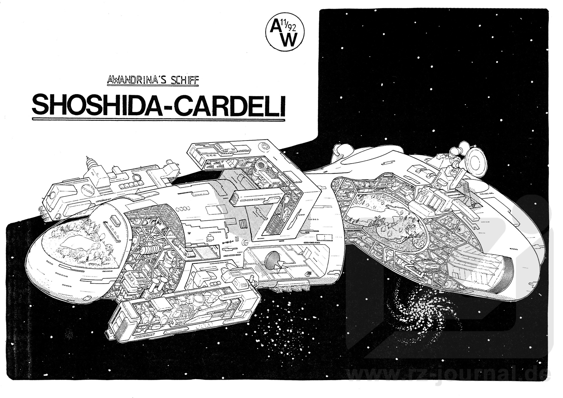 Allgemeines: Die Shoshida-Cardeli, der Name bedeutet "Stolz von Cardel" (Awandrina's Heimatplanet), ist das Reiseschiff, das Awandrina von ihrer heimatlichen Superintelligenz geschenkt bekam. Weil die Shoshida-Cardeli nicht in erster Linie für den Kampf gebaut wurde, sind alle Bordwaffen in dem austauschbaren Steuerbord-Pylon untergebracht. Im Gefecht muss das Schiff also stets diese Seite zum Gegner wenden. Wahlweise kann dafür ein zweiter Protarder-Gravitator angeflanscht werden. Das Schiff ist - auch natürlich infolge seiner hochstehenden Technologie - ein Einzelstück. Zwei äußerlich gleiche Schiffe existieren zwar, was politische und Sicherheitsgründe hat, sind jedoch nur mit konventioneller Technik bestückt und somit verglichen mit der Shoshida kaum mehr als Attrappe. Die Shoshida ist mit ihrer Länge von ca. 2.500m das größte Schiff der cardelianischen Flotte und zugleich ihr Flaggschiff. Hervorstechendste Merkmale sind die umfangreiche 6-D- und Formenergietechnik. Atlan's viel kleinere Morat-Them operiert zeitweilig von diesem Schiff aus.