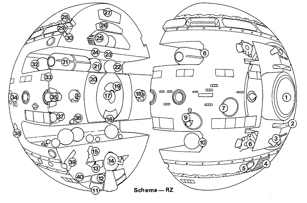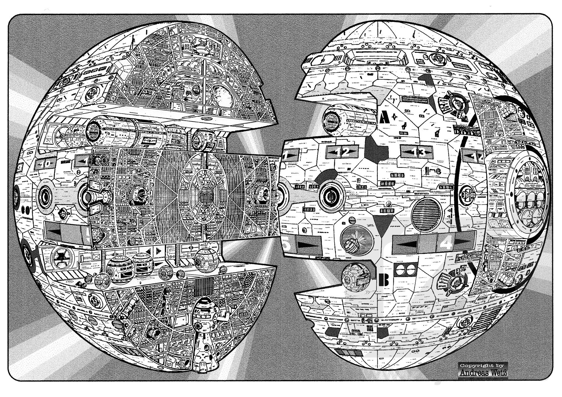 Allgemeines: Wie man sich erinnert, war die CREST IV Perry Rhodan’s Flaggschiff während der Kämpfe mit den Zeitpolizisten und der ersten Schwingungsmacht, in den dreißiger Jahren des 25. Jahrhunderts. Bei Perry Rhodan’s Rückkehr aus der Galaxis M-87 musste die CREST aufgegeben werden. Sie zog danach weiter herrenlos ihre Bahn durch den intergalaktischen Leerraum. Durch einen unwahrscheinlichen Zufall wurde sie im Jahre 1.241 NGZ von Maahks entdeckt und von einem terranischen Matrix-Tender geborgen. Die Terraner planten zunächst einen Totalumbau des Schiffes, um danach ein weiteres Trägerschiff zur Verfügung zu haben. Die Umbaukosten wären jedoch entgegen ersten Schätzungen astronomisch geworden. Die CREST kreist deshalb inzwischen als Museum antriebslos um Luna. Dort kann man für 295,- Galax dieses Original-Ultra-Schlachtschiff des Solaren Imperiums besichtigen. Wäre der Umbau durchgeführt worden, hätte die CREST etwa so ausgesehen, wie in der Zeichnung dargestellt. Dort erkennt man, dass der überwiegend waagerechte Deckaufbau weitgehend erhalten geblieben ist. Im Unterschiff wurde die gesamte Sektion mit den Linearkonvertern herausgeschnitten und gegen ein Hypertrop der Basis, verbesserte HÜ-Generatoren und ein effizienteres Anti-Grav ausgetauscht. Ganz weggefallen ist der Ringwulst. Das entsprechende Material ist gleich wieder in den Umbau eingeflossen. Obwohl etwa 20% des Hangarkugelumfanges weggefallen sind, finden durch eine bessere Platzausnutzung nach wie vor 50 Korvetten Platz. Der bedeutendste Umbau ist die Einbeziehung zweier RoRo-Decks, “Flugdeck A“ und “Flugdeck B“ genannt. Die Höhe dieser Flugdecks beträgt 278 Meter. Selbst die größten Springerwalzen der Rusuma-Superior-Klasse können also hier einfliegen. Auf beiden Flugdecks können noch entweder 36 200-Meter-Kreuzer oder 76 100-Meter- Kreuzer abgestellt werden. Weiterhin wurden noch zwei 40%-Umlaufhangars für weitere 36 100-Meter-Kreuzer integriert. Wenn das Schiff wirklich so umgebaut worden wäre, hätten die Terraner das leistungsfähigste Trägerschiff seit der Basis besessen. Leider ging die Geschichte zunächst einen anderen Weg. Niemand weiß jedoch, ob nicht vielleicht doch eines Tages eine Reaktivierung dieses Denkmals des terranischen Raumschiffbaus ansteht.