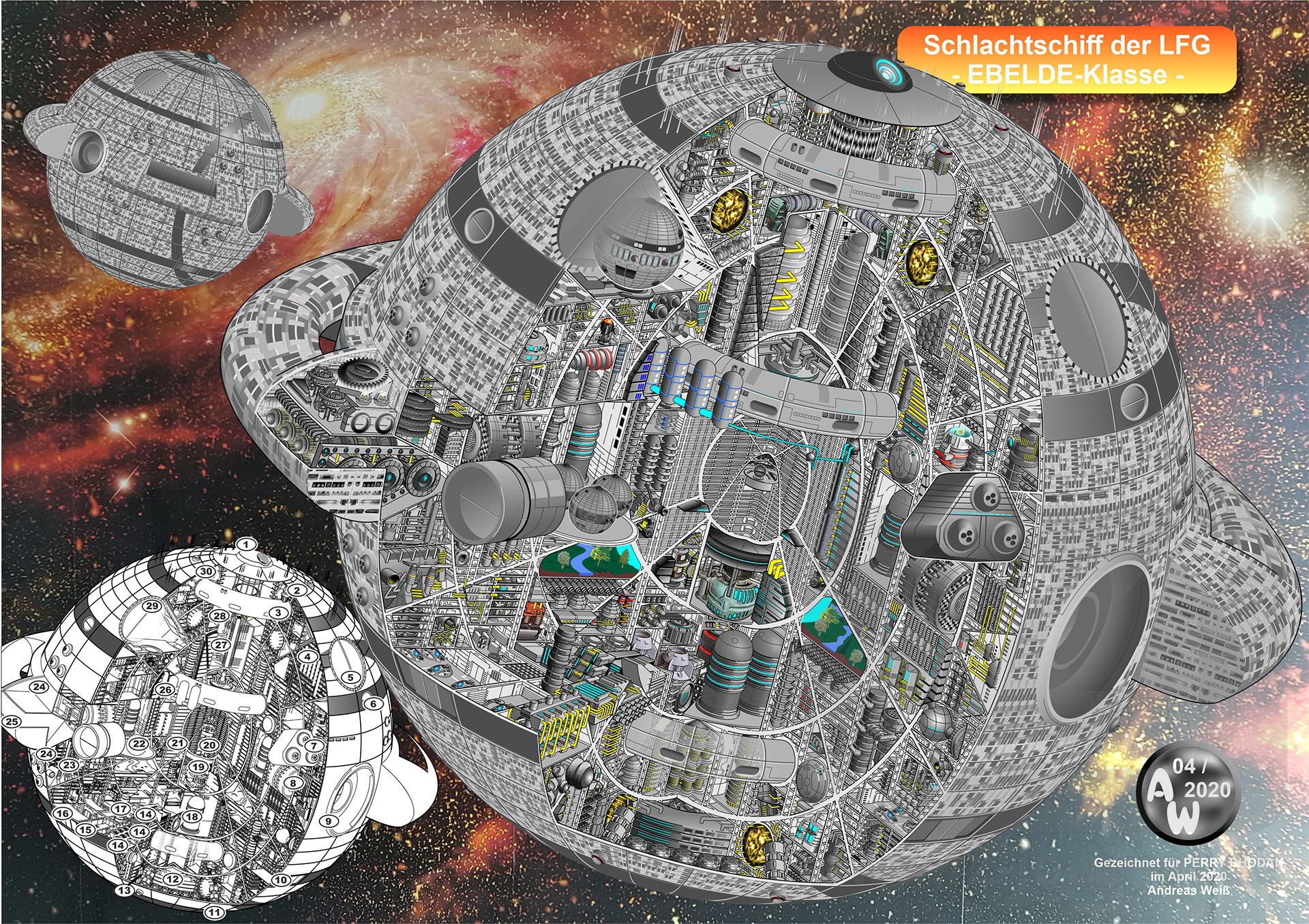 Technische Daten: Durchmesser der Kugelzelle netto: 1000 Meter Besatzung: Kernmannschaft ca. 900 Besatzungsmitglieder im Drei-Schicht-Betrieb plus 100 Mann als „Springer-Kräfte“, zuzüglich etwa 1000 Besatzungsmitglieder für die Beiboote. Optional weitere 2.600 Mann Landungstruppen und Gäste. Beiboote: 4 x 100-Meter-Kreuzer, 12 x 60-Meter-Korvetten, 24 Space-Jets, zumeist nur der 35-45 Meter-Klassen, 24 Shifts unterschiedlicher Typen. Offensivbewaffnung: 48 Hauptgeschütze in energieautarken Drillings-Kasematten (Transform, KNK und Intervall), 18 leichte Drillingsgeschütze (Impuls, Desintegrator, Paralyse) Letztere sind am oberen Pol direkt mit einem Energiespeicherring verbaut, weshalb sie bauartbedingt viel kleiner sind als ihre Gegenstücke am unteren Pol, aber trotzdem eine erheblich höhere Feuerkraft und Energieleistung entfalten können. Dafür sind die unteren Geschütze einzel-autark und nicht von einer zentralen Energieversorgung abhängig. |