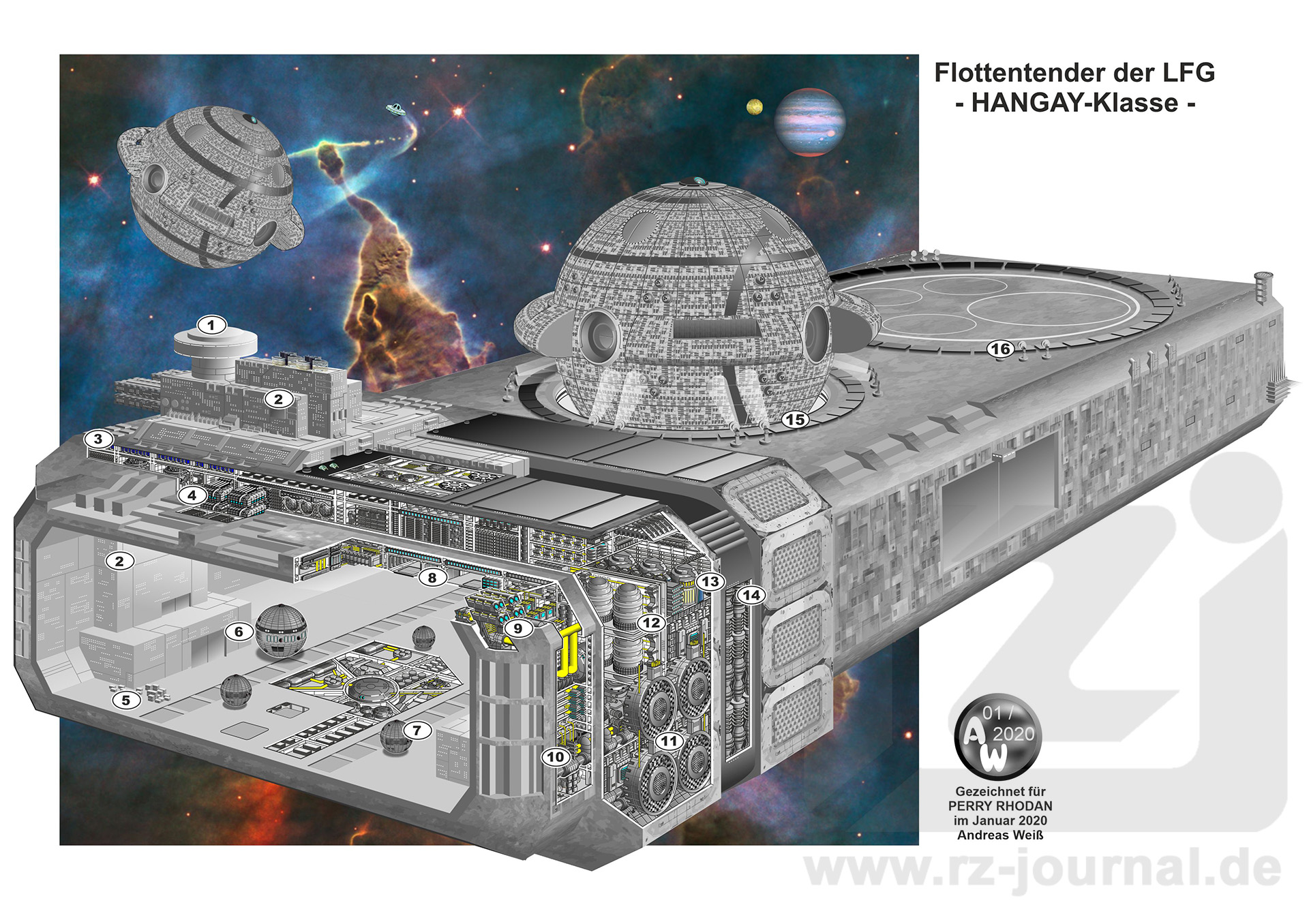 Der abgebildete Tender stellt eine neuere Klasse von Tendern dar. Es hatte sich herausgestellt, dass relativ viele kleinere Tender die großen Schiffe der Liga freier Galaktiker nicht ausreichend versorgen können und jene Schiffe, die das können, die übergroße ANDROMEDA-Klasse, die bis zu 4.000-Meter-Raumschiffe aufnehmen und versorgen können, eine zu geringe Stückzahl hatten. Diese Schiffe können halbversenkt ein 1.000-Meter-Schlachtschiff aufnehmen. Dann passt auf den Stellplatz am Bug immer noch ein fest stehendes 1.500-Meter-Schlachtschiff. Zwei davon passen auf der oberen Landefläche nicht nebeneinander. Diesen Kompromiss ging man aus Gründen der Produktionskosten ein. So waren höhere Stückzahlen zu realisieren. Ein hoher zusätzlicher Nutzwert kommt daher, dass in den RoRo-Hangar Schiffe bis 500 Meter Durchmesser einfliegen können. Der Hangar kann, schirmfeldversiegelt, athmosphärisches Arbeiten ermöglichen. Auf dem oberen Flugdeck wird in der Regel im Raumanzug gearbeitet. Wird, wie im Bild, ein 1.000er halbversenkt, ragt er in den RoRo-Hangar ein, was das immerhin auch an der unteren Schiffshälfte ermöglicht, den RoRo-Hangar jedoch für größere Einheiten etwas einschränkt. Die lichte Höhe des Einfluges beträgt 625 Meter, die gesamte Höhe bis zur Spitze des Brückenturms liegt bei 950 Metern. Die Breite beträgt 1.300 Meter (mit Wulsten 1.350), die Gesamtlänge des Quaderkorpus‘ liegt bei 3.750 Metern. Die Schiffsbesatzung kommt mit lediglich 1.200 Mitgliedern für einen durchgehenden Drei-Schicht-Betrieb aus. Das geht auf einen hohen Grad an Automatisierung zurück. Allerdings kommen noch bis zu 25.000 Besatzungsmitglieder als technisches und logistisches Personal hinzu. Die Unterkünfte des Schiffspersonals sind im Brückenaufbau in Flugrichtung hinten links untergebracht, jene der anderen Besatzungsmitglieder und Gäste-Besatzungen in fünf seitlichen Blöcken im RoRo-Hangar. Dort wo die große Steuerbord-Seitenschleuse ist, befindet sich kein Unterkunftsblock. |