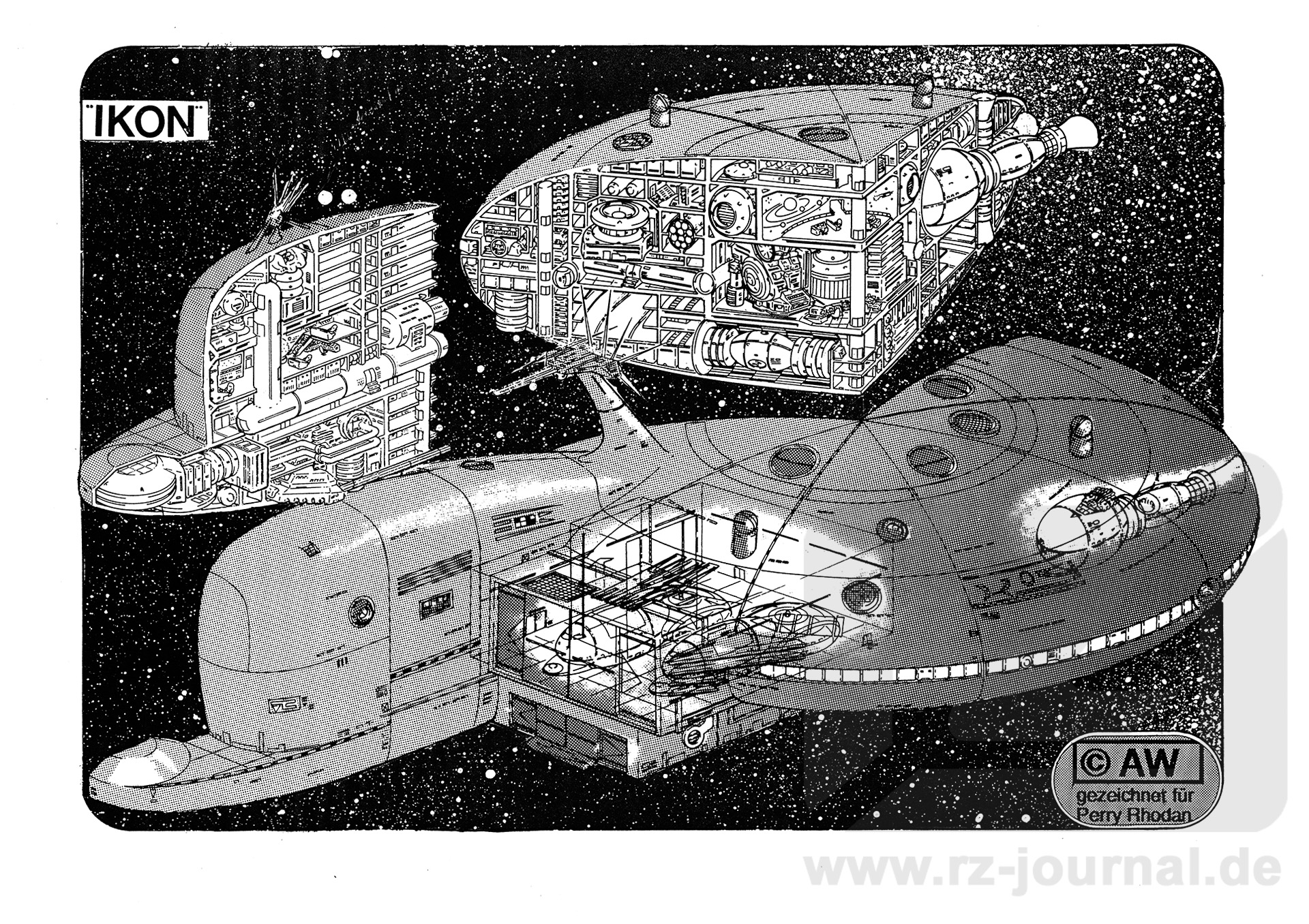 Allgemeines: Die Aoken stehen technisch an der Schwelle vom Linearantrieb zum Metagravtriebwerk. So stellt die Ikon einen Prototyp dar. Aus Sicherheitsgründen ist sie neben dem Metagravantrieb auch mit zwei starken Impulstriebwerken bestückt. Beide sind mit einem kleinen Linearkonverter verschaltet, so daß die Ikon im Falle des Ausfalles des Metagravs immer noch in akzeptabler Zeit einen naheliegenden Planeten überlichtschnell erreichen kann. Die Ikon mißt im Diskusdurchmesser 179,24m. Die Höhe des Diskus beträgt 35,04 m. Die Gesamtlänge beträgt 250m. Die größte Höhe über alles 52,78m. Aoken erreichen eine durchschnittliche Körpergröße von ca. 2 Metern und sind Sauropoide, die aus kleineren fleischfressenden Dinosauriern hervorgegangen sind. Trotz ihrer genetischen Herkunft sind die Aoken nicht räuberisch oder aggressiv. So ist auch die Ikon nur mäßig bewaffnet. Vier Thermostrahler stellen das ganze Potential des Schiffes dar. Diese