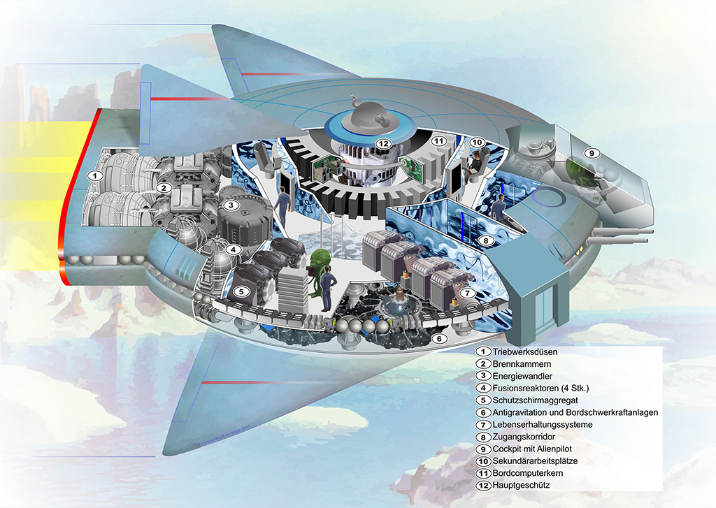 Prähistorische Risszeichner? Nicht ganz ernst gemeint inspirierte mich der Artikel in der „Sagenhafte Zeiten“ (Nr. 5 aus 2013, Seite 5) über den Sturmgott von Holmul zu einer etwas ungewohnten Zeichnung. Seit meiner Jugend haben mich die Bücher von Erich von Däniken sehr inspiriert. Warum sollten nicht frühere Menschengenerationen versucht haben, bildlich darzustellen, was sie nicht verstanden. Man arbeitet mit Symbolen aus Bekanntem und extrapoliert sie zu „magischem“. Anders arbeite ich auch nicht, wenn ich für die Science-Fiction-Serie „PERRY RHODAN“ Risszeichnungen der dort vorkommenden Raumschiffe fertige. Ich sah das steinerne „Rollsiegel“ des Sturmgottes, die dazu passende Strichskizze - und erkannte mit Risszeichner-Blick sofort, was der Künstler damals gemeint haben könnte. Genauer – ich erkannte, was die Arbeit des damaligen Künstlers mit meiner heutigen Arbeit für PERRY RHODAN gemeinsam hat. Fasziniert war ich, dass während des Skizzierens und der Ausarbeitung tatsächlich etwas Logisches entstand. Auch ich habe natürlich mit Symbolen gearbeitet. Motorenteile heutiger Technik wurden verfremdet und in einen anderen Zusammenhang gestellt. Eigenkreationen von Aggregaten ergänzen das Ensemble. So entstand in der Art einer Collage eine etwas andere, digitale, Version des Sturmgottes von Holmul. Doch während die Steintafel sicher noch Jahrhunderte überdauern wird, ist das Verfallsdatum meiner Datei wahrscheinlich schon viel früher programmiert. Wir leben in einem digitalen - einem „spurlosen“ Zeitalter. Meine Zeichnungen wird kein Archäologe finden und sich wundern, was für seltsame Kalender die Menschen im 21sten Jahrhundert gezeichnet und welche Götter sie damit verehrt haben mögen. Fast bin ich neidisch auf den damaligen Künstler. Die wichtigsten Merkmale des „steinernen“ Werkes finden sich wieder. Vorne (rechts) thront erhaben eine Gestalt, die wohl der Pilot sein muss. Meine künstlerische Freiheit hat daraus einen Alien-Piloten nicht humanoider Herkunft gemacht. Gemischte Besatzungen sind schon seit „STAR-TREK“ nichts Unerhörtes mehr. In einer Art umlaufendem Mittelgang finden sich Arbeitsplätze, von denen aus das Mittelaggregat (in meiner Zeichnung z.B. eine Waffe und der Bordcomputer) bedient werden kann. Zwei sind auf der Steintafel zu sehen, bei mir ebenfalls. Nur sitzen meine beiden Sitze nicht „mittig“. Den Rest des Fluggerätes habe ich frei mit Aggregaten und Triebwerken gefüllt. Das Heck gab keine näheren Details dafür vor. Ich wünsche viel Spaß beim Betrachten und Vergleichen. |