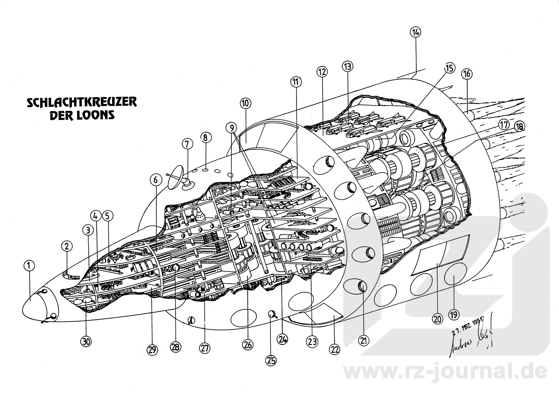 Technische Daten: Besatzung: ca. 4-00 Loons, Länge: ca. 620m, größter Durchmesser: ca. 272m, Beschleunigung: ca. 2.500 (!) km/sec², Reichweite: ca. 60 Mio. Lichtjahre, Bewaffnung: