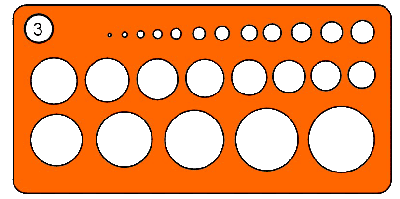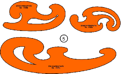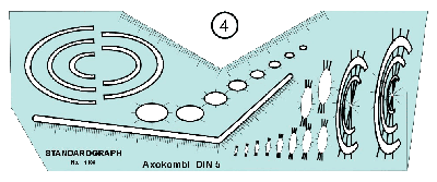 Axokombi (4) Dieses hat perspektivisch genaue Schablonen der jeweiligen Kreis, bzw. Ellipsen. Um nun größere Ellipsen ziehen zu können, benötigt man auch ein oder mehrere Bogenlineale (5).