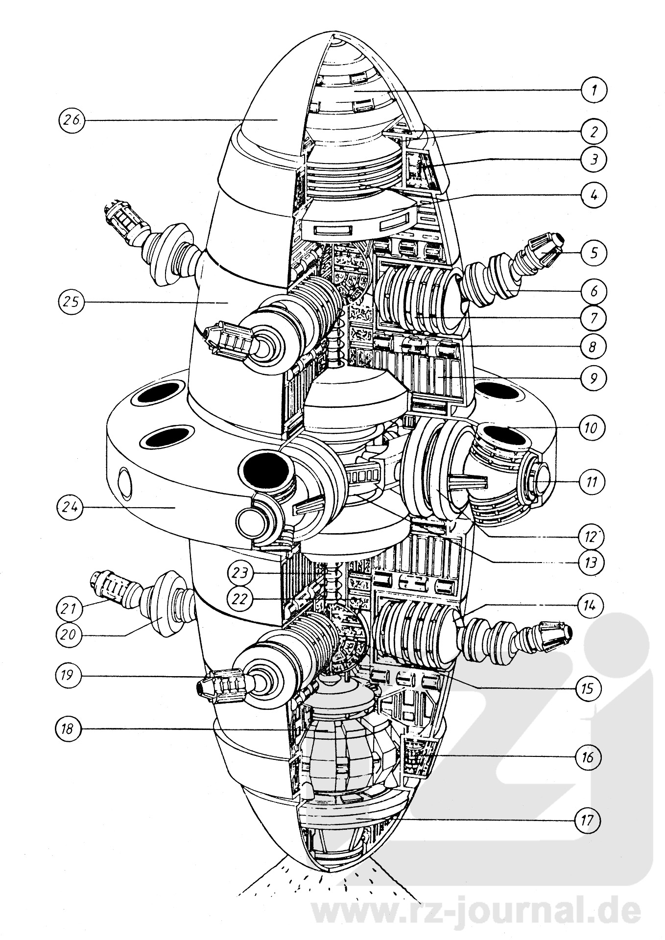 Triebwerks (insg. 16; Impulsstrahl wird durch Fesselfelder geschwenkt und