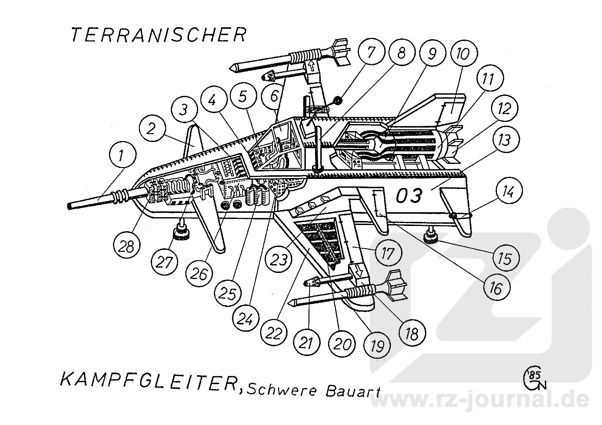 Allgemeines: Flache Bauweise, Deltaflügel, überlichtschnell, Kampfauftrag für Weltraum und Atmosphärenflug, 2 Mann Besatzung, Beschleunigung: 700 km/sec², Reichweite: ca. 50 000 Lichtjahre, Länge ü.a.: 24 m, Breite ü.a.: 16 m, Höhe ü.a.: 7 m |
