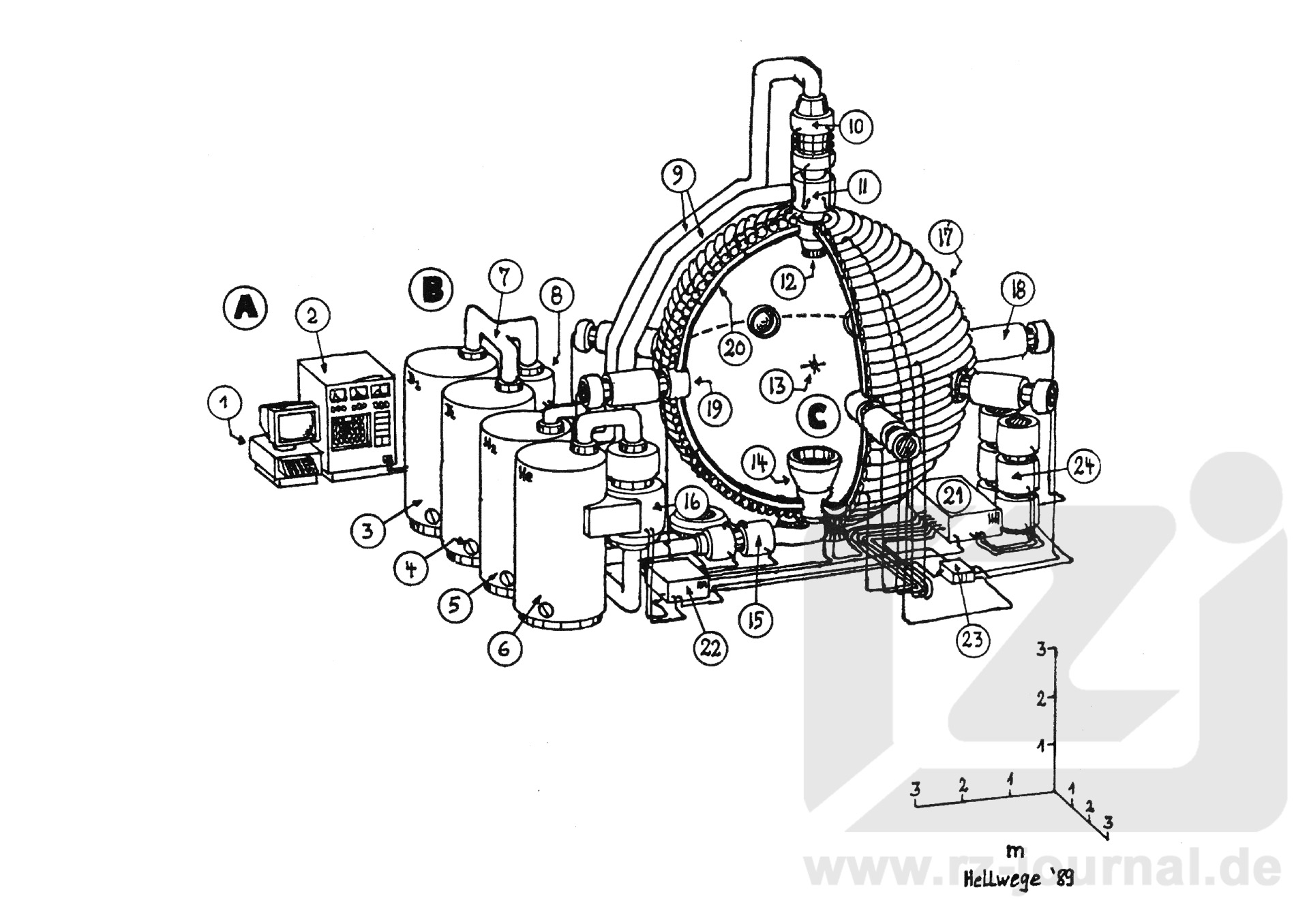 Technische Daten: Leistung Vollast: 12 MW, Leerlauf: 98 KW, Verbrauch Vollast: 3 kg/min, Leerlauf: mehrere g/min A Steuerbereich B Fusionsmittel/Abfall C Fusionsreaktorkugel |
