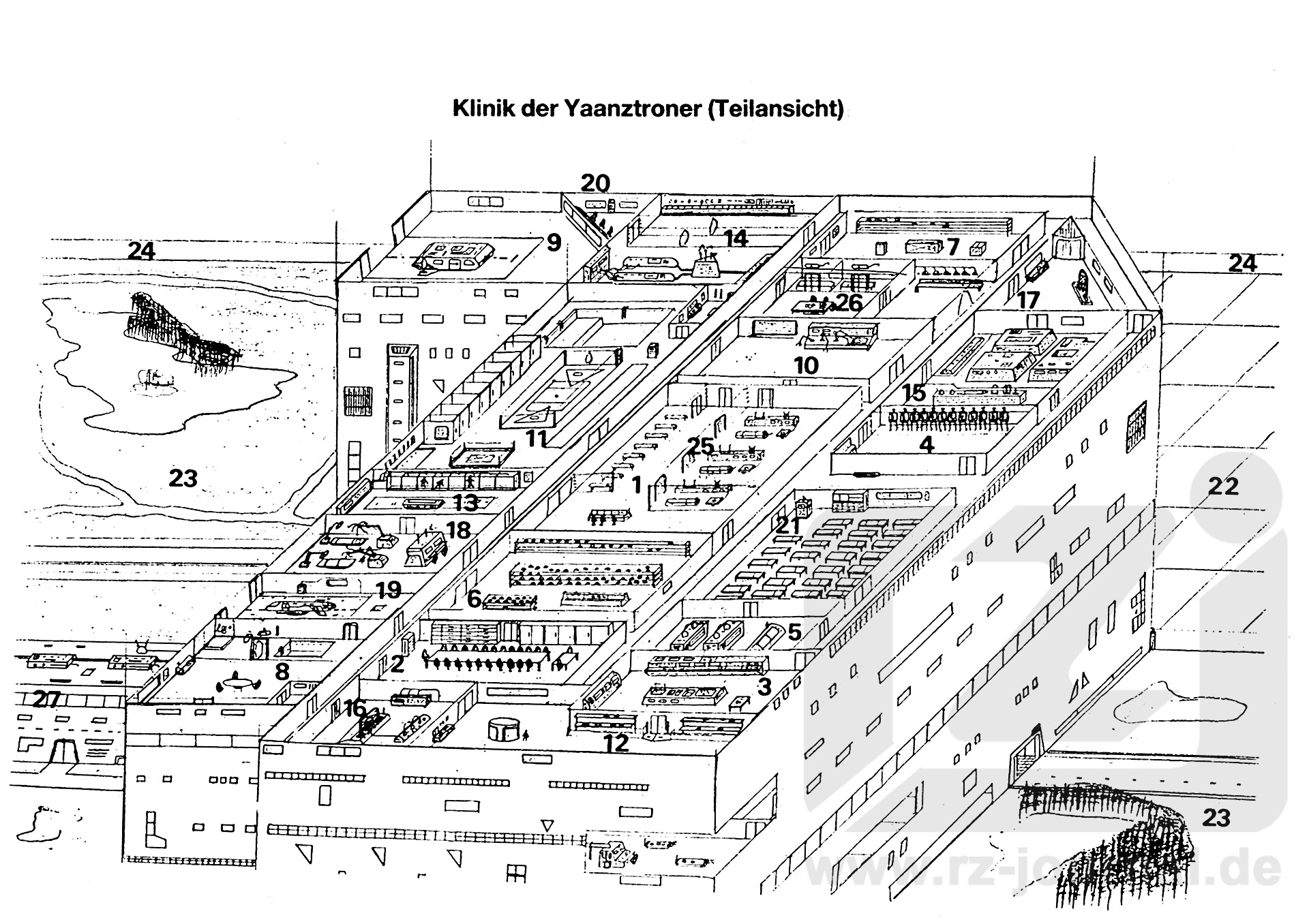 Allgemeines Die hier gezeigte Klinik ist eine von mehreren auf dem Planeten Yaanzar, in denen das PGT (Parareguläre Gleichheitstransplantation)-Verfahren praktiziert wird. Dieses Verfahren wurde entwickelt, da bei den Bewohnern der Galaxis Naupaum die Lebenserwartung des Körpers höher liegt als die des Gehirns. Naupaumer, die es sich leisten können, lassen sich daher in einer der Kliniken behandeln, indem ihnen vor dem Absterben ihres Gehirns eine neues junges Gehirn, meist das eines Bordins, transplantiert wird. Das neue Gehirn dient ab dann als organische Grundlage des eigenen Bewußtseinsinhalts. In dieser Rißzeichnung ist eine Station mit PGT-Anlage einer solchen Klinik auf Yaanzar dargestellt. |