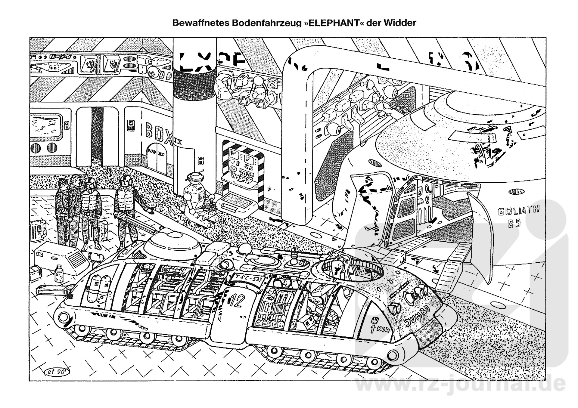 Zeichnung: Hier befindet sich der Jumbo noch in einem Hangar eines Trägerschiffes. Im Hintergrund kann man ein Landungsboot des schweren Typs, genannt Goliath, sehen. Dieser Typ eines Wegwerf-Landebootes wurde von den Widdern in ihren eigenen geheimen Fertigungsstätten hergestellt und fand meist bei gefährlichen Hit- und Run-Aktionen Verwendung. Einige Rebellen diskutieren gerade die Beladung und die bevorstehende Mission. Daneben ist ein Wartungsroboter zu sehen. |