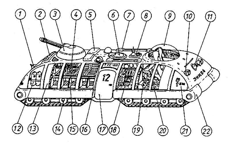 Technische Daten: Abmessungen: L x B x H = 10 m x 4 m x 2,5 m (mit Kuppel 3 ) Masse: 7500 kg (durch Leichtbau) Bewaffnung: 1 mittelschweres MHV-Geschütz, 2 leichte Multifunktionsgeschütze, 1 Schutzschirmgenerator für HÜ- und Paratronschirm, 1 ECM-Anlage Antrieb: 2 unabhängige nuklearelektrische Kettenantriebe Besatzung: 3 Marin Besatzung und max. 10 Passagiere
