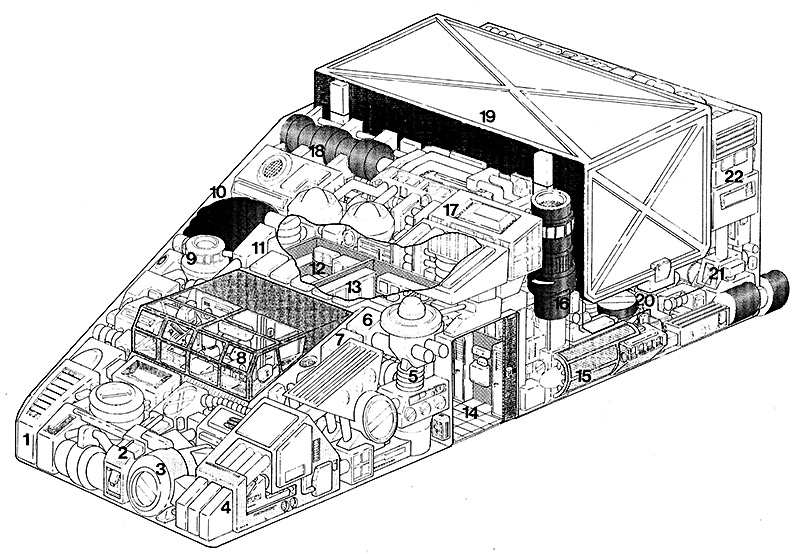 Technische Daten: Länge: 18,5 m Breite: 7,5 m Höhe: 5,0 m² Beschleunigung - frei: 400 km/sec - erdgebunden: in 6,5 sec. von 0 - 100, Höchstgeschwindigkeit in 45 sec. (ohne Unterstützung durch die Gravojets) Besatzung: 1 - 12 Bewaffnung: sofern ohne entsprechendes Modul, keine Stückpreis des Grundkörpers: ca. 885.000 Galax Stückpreis der Module: zwischen 15.000 (Fracht-) und etwa 600.000 (Aufklärer-) Galax Stückzahlen, Stand 1201 NGZ: ca. 850 Stück, Tendenz steigend ca. 15.600 Module in 16 verschiedenen Ausführungen Produktionsbeginn: November 1200 NGZ auf Luna Höchstgeschwindigkeiten - im Weltraum: 200.000 km/sec. - atmosphärisch: Mach 12 - am Boden: 400 km/h - über Wasser: ca. 270 Knoten - getaucht: ca. 200 Knoten Einsatzbasen: Raumschiffe von 100 m Durchmesser und größer (Odin: 12 Dreadnoughts mit 216 Modulen) |