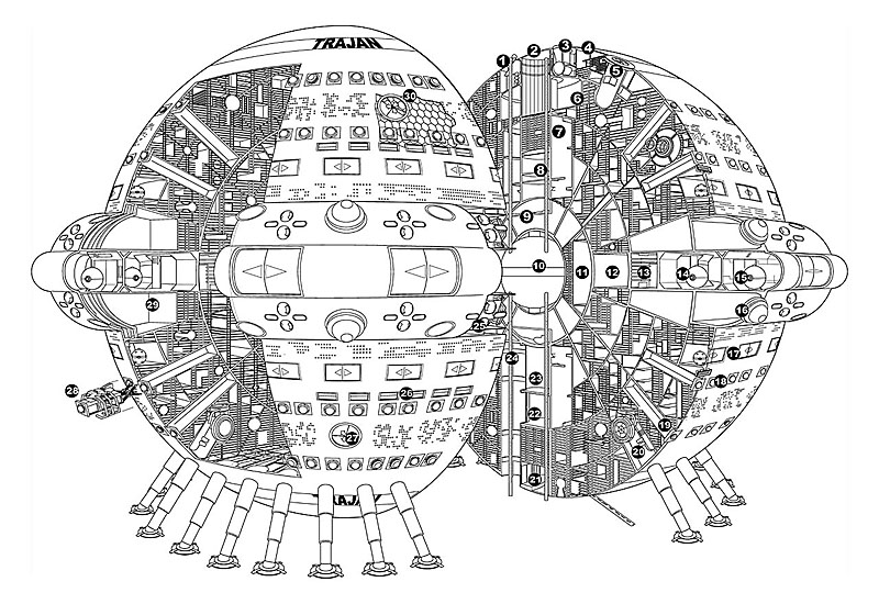 Die TRAJAN ist ein Kugelraumer vom gleichen Bautyp wie die legendäre MARCO POLO. Ursprünglich im Jahr 3459 n. Chr. als Ersatz für das alte USO-Flaggschiff IMPERATOR erbaut, wurde sie zunächst nicht in Dienst gestellt, sondern eingemottet, dann aber etwa seit 1300 NGZ von der Neuen USO reaktiviert und auf den technisch allerneuesten Stand gebracht. Die sehe aufwendigen Umbauten kosteten Unsummen. Das führte dazu, dass die TRAJAN erst im Jahre 1311 NGZ in Dienst gestellt werden konnte. Die TRAJAN dient der USO als mobiler Großträger für Kleinraumer und Ausweich-Hauptquartier, sollte Quinto-Center selbst gefährdet sein. Eine Stammbesatzung von 2000 Männern und Frauen ist erforderlich, um einen Drei-Schicht-Betrieb sicherzustellen, so dass die TRAJAN immer voll einsatzbereit ist. Weitere 4000 Männer und Frauen bedienen die Beiboote. Zusätzliche USO-Spezialisten und Besatzungsmitglieder können an Bord genommen werden, falls dies erforderlich sein sollte. Die TRAJAN ist mehrfach redundant ausgerüstet. Das umfasst alle Bereiche. Sie kann sich auf mehrere Arten überlichtschnell bewegen – mittels Metagrav, Lineartriebwerk oder Transitions-Sprungtriebwerk. Die Energieversorgung wird von vier großen internen Hypertrops, sechs kleinen Not-Hypertrops, sechs NUGAS-Kraftwerken und unzähligen Fusionsmeilern sowie durch den Prototyp eines Hyperraum-Permanentzapfers sichergestellt, als Zwischen- und Notspeicher dienen große und kleine Gravitrav-Speicher. Das Schiff ist in hohem Maße modular gestaltet worden. Fast alle alten Waffenkuppeln wurden entfernt. Stattdessen nehmen nun »Taschen« von rechteckigem Querschnitt die Waffenmodule auf. Alle Waffen haben genormte maximale Außenmaße und können demzufolge beliebig ausgetauscht werden. Lediglich beim überschweren Pol-Intervallgeschütz, dem »Affengift«, würde der Umbau geringfügig länger dauern, weil seine »Tasche« komplett ausgetauscht und Peripherieaggregate umgruppiert werden müssen. Um Modernisierungen und Umbauten zu vereinfachen wurde die fortschreitende Miniaturisierung der Technik und das enorme Volumen der Zelle genutzt, um sechs große Reparaturschächte in das Schiff einzuziehen, die von verschiedenen Stellen aus in verschiedenen Richtungen weit in das Schiff hineinreichen. Auch im Schiff verlaufen mehrere solcher großen Schächte. Die Kreuzerhangars werden ebenfalls zu diesem Zweck genutzt, so dass selbst große Aggregate tief aus dem Schiffsinneren, wie z. B. die zentralen Gravitrafspeicher, in einem Stück ausgetauscht werden können. Kein anderes Großraumschiff der Milchstraße kann der TRAJAN zur Zeit das Wasser reichen, was konventionelle Feuerkraft oder Umbauoptionen und -zeiten angeht. Durch ihre Variabilität kann sie der USO noch viele Jahre als Flaggschiff dienen. Kein unerheblicher Umstand, bedenkt man die Baukosten. Im Bild zeigt die TRAJAN gerade die typischen Charakteristika eines in Kürze bevorstehenden Alarmstarts. Die Impulstriebwerke laufen schon und die Metagravs sind aktivert und schillern demzufolge grünlich. |