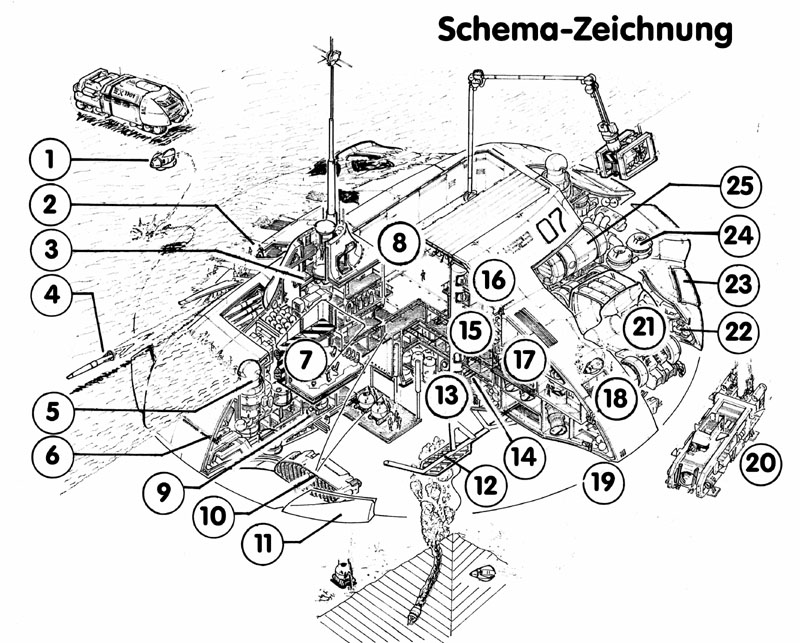 Diese diskusförmige Konstruktion mit 50 Metern Durchmesser und etwa 20 Metern Höhe ist das bevorzugte Fahrzeug für Erkundungsunternehmungen in flüssigen Medien. Es stellt ein mobiles Laboratorium für die verschiedensten Forschungsdisziplinen (u.a. Geologie, Geophysik, Biochemie, Biologie) dar, die jeweils nach Mission individuell konfiguriert werden können. Sowohl in der terranischen Explorerflotte, diversen nicht-staatlichen Forschungseinrichtungen als auch in der privaten Industrie werden die verschiedensten Varianten des Amphigleiters benutzt. Die dargestellte Konstruktion zeigt das aktuelle Modell der Explorerflotte, ausgelegt für eine Schiffsführung von fünf Personen, mehreren Dutzend Robotern und bis zu 26 Wissenschaftlern über eine Missionsdauer von sechs Monaten. Der Amphigleiter wurde so konzipiert, dass er aus einem im niedrigen Orbit befindlichen Raumschiff abgesetzt, eigenständig eine planetare Oberfläche erreichen, in verschiedensten Flüssigkeiten tauchen und sich fortbewegen sowie anschließend in den Orbit zurückkehren kann. Unter Einsatz eines modifizierten Gravo-Jet-Triebwerks und eines Kontur-Prallfeldschirms erreicht der Gleiter im getauchten Zustand eine normale Marschgeschwindigkeit von etwa 60 km/h und widersteht Drücken von 100 MPa (entsprechend 1000 bar bzw. etwa 10.000 Metern Tauchtiefe unter irdischen Verhältnissen). In gasförmigen Atmosphären werden etwa 1500 km/h per Gravo-Jet-, die Orbitgeschwindigkeit bis ca. 28.000 km/h per Gravopuls-Triebwerk erreicht. Der Amphigleiter ist von seiner Masse her mit einer Space-Jet der VENUS-II-Klasse vergleichbar. Die verfügbare Systemleistung beträgt 510 Gigawatt. |