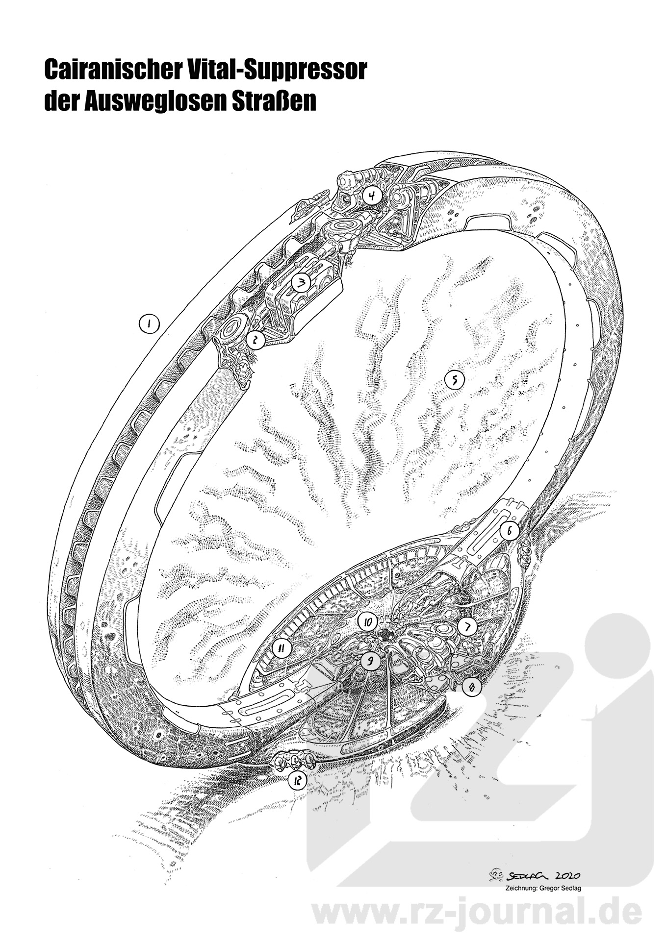 Nachdem die Cairaner den Zugang zur Vitaltränke in ihrer Heimatgalaxis Ancaisin verloren haben, entwickeln sie in der von ihnen besetzten Milchstraße das System der Vital-Suppressoren. Diese Geräte dienen dazu, Vitalenergie von Lebewesen in ihrem unmittelbaren Wirkungskreis abzuschöpfen. Die dabei gewonnene Lebensenergie kann gespeichert und in Form von »Vital-Transfusionen« (ViTraf) Dritten zugänglich gemacht werden. Vital-Suppressoren werden auf Gefängnis-Raumstationen, den »Ausweglosen Straßen«, aber auch auf ganzen Planeten installiert, wenn diese sich gegen die Regeln des Cairanischen Friedensbundes auflehnen. Die betroffenen Bevölkerungen verlieren ihre Lebensenergie, Lebenslust und Lebenskraft und werden zunehmend lethargisch, sodass sie binnen weniger Generationen aussterben. Das ganze Gebilde rotiert langsam, in 23 Minuten und 39 Sekunden einmal um sich selbst. Der Vital-Suppressor liegt nicht direkt auf dem Boden auf, sondern bewegt sich auf einem sehr dünnen Antigravfeld. Gesteuert werden die Vital-Suppressoren durch cairanische Vital-Navigatoren. Diese kontrollieren die Funktion des eigentlichen Vital-Suppressors über ihre muldenförmigen Steuerkonsolen aus benachbarten hallenartigen Kontrollstationen heraus. |