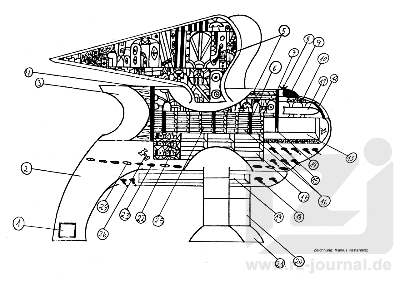 Technische Daten: 3-40 Meter lang, 315 Meter hoch und 114 Meter breit. Es ist größtenteils mit Robotern besetzt, hat deshalb auch nur e«n Beiboot an Bord. Es wird zu Hilfe gerufen, wenn ein Schwinger,schiff schwer beschädigt ist; auch zum Bau neuer Stützeunkte auf Asteroiden verwendet. Besatzung: 38 Sawpanen und Roboter. |