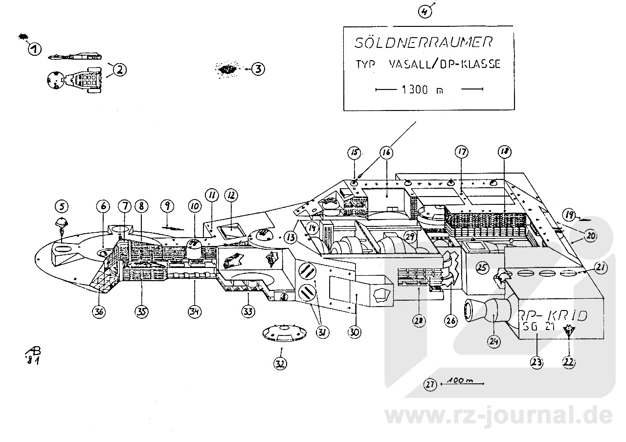 Flaggschiff der 21.Soldgruppe "Refürp Krid" techn.Daten: Länge 1300m , Breite 600 m , Höhe 24o m Unterlichttriebwerk: leistungsstarke Plasmatriebwerke (EWB-R Prinzip) mit max. Beschleunigung von a= 69o km/secq. Überlichttriebwerk: für galaktische Einsätze: Linearflugtriebwerk bekannter Konstruktion, für intergalaktische Einsätze: Sofortversetzung durch hochenergetische Rangor-Anlage mit max. Reichweite von 240 Mpc Beibootflottille: 10 Kreuzer der REVUE-Klasse (Ø 95 m, 20 Mann Besatzung, a-700 km/secq. Reichweite 7 Mpc); 18 Korvetten der CIDER-Klasse (Ø 24 m, 4,710,200 kpc); 15o Zerstörer der OTHO-Klasse (L. 10 m, 1,745, 90) Besatzung: mind. 150, max. 5350 Dienstgrade Bewaffnung: Defensiv-Reflektorschirme und Energieabsorber Offensiv-Konstantnadelrißkanonen, Raumtorpedos, Energiegeschütze |