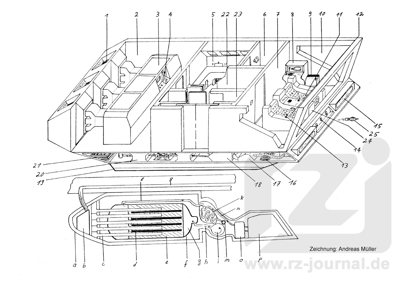 Der Kernreaktor im Querschnitt: a) Schutzmantel; b) Kontrollrechner; c) Kontrollstäbe; d) Uranbrennstoffstäbe; e) Graphit-Bremssubstanz; f) Druckbehäiter; g) Reaktor; h) Kühlgasleitung; i) Gebläse; k) Wärmeaustauscher; I) Leitung für heißes Gas; m) Wasserleitung; n) Leitung für Dampf; o) Turbine; p) E-Werk; q) Leitung zum Cockpit. |