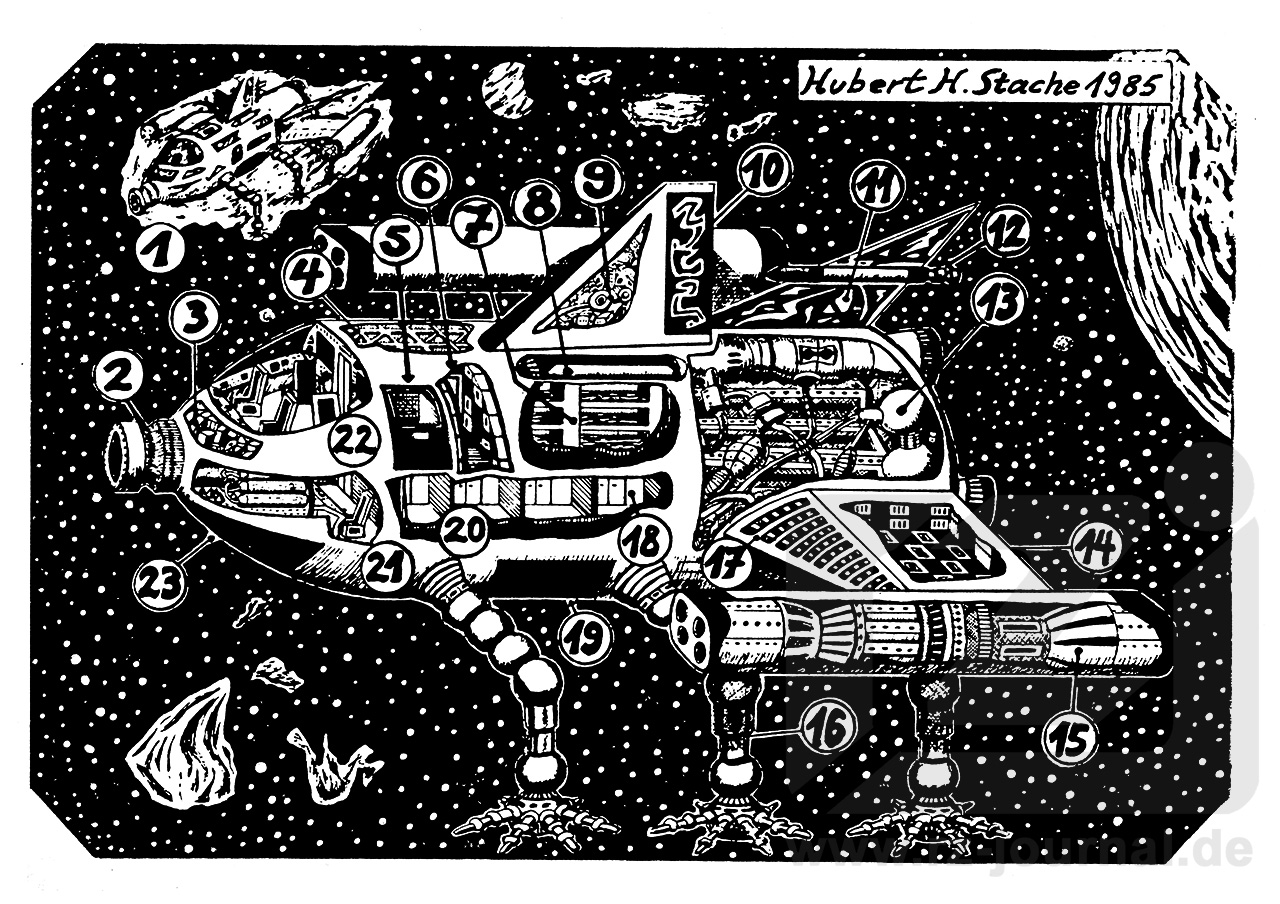 14. Spezialtank 15. Korrektur- und Bremstriebwerk 16. Landestütze 17. Ortungsanlage 18. Räume für andere Spezies 19. Lastenschleuse 20. Tank für 13 21. Energiespeicher und Positronik für 2 22. Zentrale 23. Personenschleuse. |
