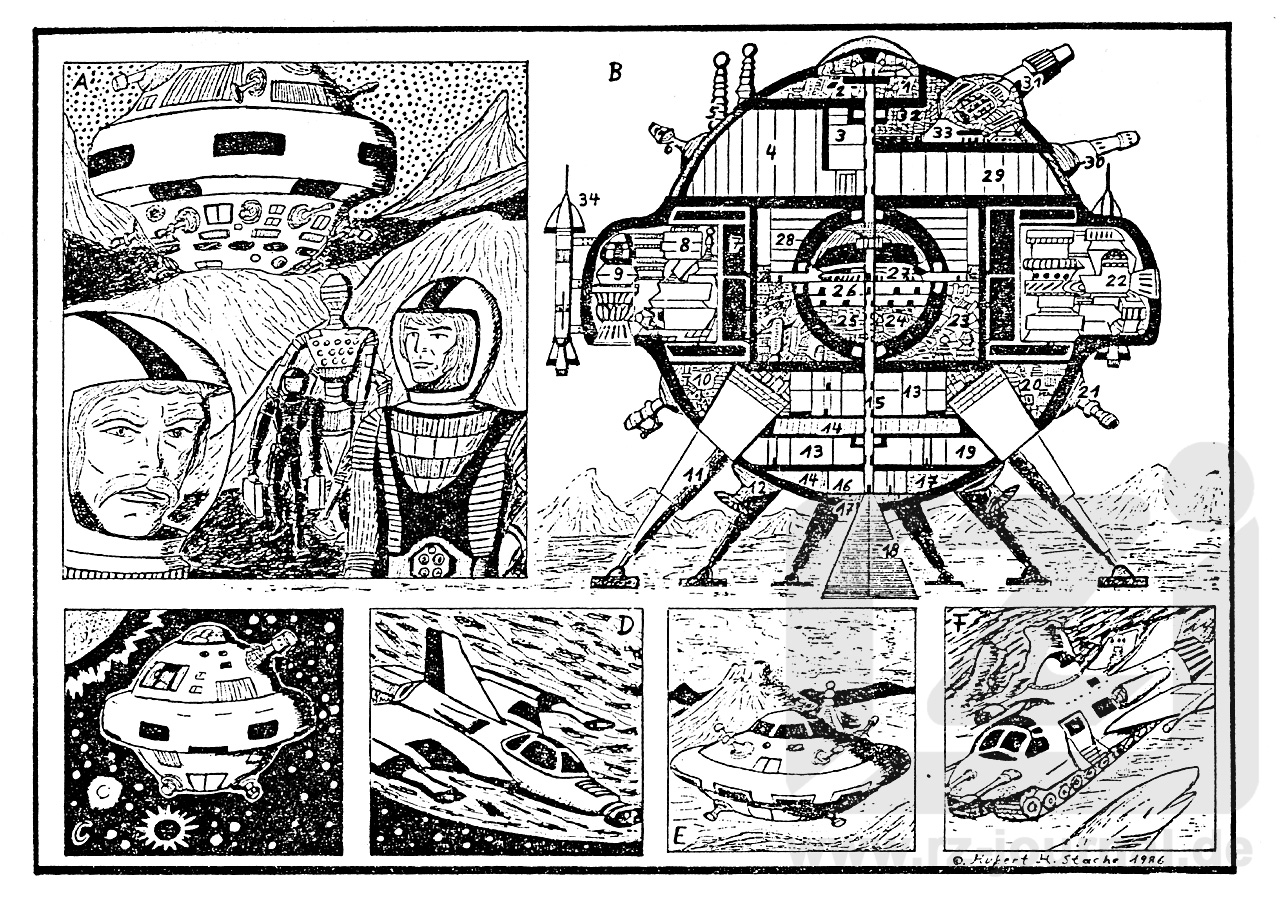 C. Kugelbeiboot (Ø 25 m, 2 Stck., 5 Mann Besatzung) D. Ein-Mann-Jäger (Länge: 15 m. 12 Stck) E. Diskus-Beiboot (Ø 30 m, 2 Stck, 4-16 Mann Besatzung) F. Raumpanzer (Länge: 18 m, 6 Stck, 2-15 Mann Besatzung)