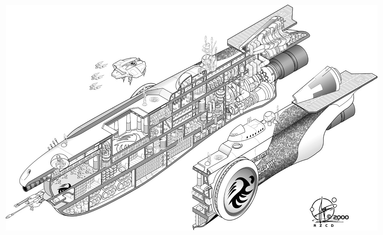 von ALLGEMEINES: Fast genau fünf Jahre ist es her, seit in dem PR-Jahrbuch 1996 Gregor Sedlag mit seinem Artikel „Die Renaissance der Risszeichnung?“ die Graphiken auf den Mittelseiten der Romane zum letzten Mal würdigte. Grund genug, gerade im SF-Kultjahr 2001 (Stanley Kubrik´s Film bleibt auch weiterhin ein Meilenstein des Produktionsdesigns) in einer kleinen Nabelschau der RZ-Szene wieder Hintergrund-Information zu diesen Zeichnungen zu bieten. Die von Gregor Sedlag vor fünf Jahren postulierte Renaissance der Risszeichnung (RZ) ist in diesem Zeitraum leider nur in Teilbereichen erfolgt. Gerade bei den Print-Medien, dem Ursprung der RZ, kam es in punkto Veröffentlichungsmöglichkeiten zu Einbußen. Nach der schon früher erfolgten Einstellung der IV. Auflage mit ihren Exklusiv-Datenblättern (DB) sind jetzt aus verwaltungstechnischen Gründen die RZ-Nachdrucke auch aus der III. und V. Auflage verschwunden. So werden Neu-Leser viele der Klassiker aus den 70er und 80er Jahren in gedruckter Form wohl nicht mehr zu Gesicht bekommen. Leider viel zu kurz gestaltete sich das Risszeichnungs-Debüt in den USA – nur ganze vier Ausgaben lang. In allen amerikanischen Übersetzungen der PR-Romane aus dem Thoregon-Zyklus erschienen Risszeichnungen. Band Nr. 1800 debütierte zunächst mit einer nur DIN A5 – großen Abbildung der legendären BASIS-RZ von Oliver Scholl, wobei hier offensichtlich ein Telefon-Fax als Druckvorlage gedient hatte. Die folgenden drei weiteren Nummern zeigten dann jedoch, wie man´s richtig macht, und brachten hervorragende Reproduktionen im amerikanischen Magazin-Großformat. Die teilweise enthusiastischen Internet-Kommentare der amerikanischen Fans waren aber leider nicht genug, und so steht eine regelmäßige Veröffentlichung von Risszeichnungen in dem SF-Großmarkt USA auch weiterhin aus. Die RZ-Veröffentlichungen in der niederländischen PR-Ausgabe stehen ebenfalls auf der Kippe. Nachdem aufgefallen war, dass der holländische Herausgeber seit Jahrzehnten regelmäßig Risszeichnungen abgedruckt hatte, ohne dabei auf die vertraglich festgelegten Nachdruck-Honorare zu achten, führten laut seinen Angaben die wenigen hundert Mark der eingeforderten Pauschal-Abfindung zu solch einer Belastung der Kostenkalkulation, dass der weitere Abdruck nicht mehr als gesichert gilt. In Risszeichnerkreisen fragt man sich jetzt, was für ein finanzielles Abenteuer die Veröffentlichung der bisher weit mehr als 1300 holländischen PR-Romane wohl sein muss. Gerüchten zu Folge sollen auch in den neuen brasilianischen und chinesischen PR-Übersetzungen Risszeichnungen zum Abdruck gekommen sein, Genaues ist aber in Risszeichner-Kreisen noch nicht bekannt. Der 1996 veröffentlichte zweite kleine RZ-Sammelband „Extraterrestrische Raumschiffe“ ist auch weiterhin im PR-spezialisierten Versandhandel erhältlich, was leider nur wenig Gutes für die Verkaufszahlen vermuten lässt. Vielleicht liegt es mit daran, dass diese vom Verlag mit den besten Absichten herausgegebene Publikation nicht genügend begleitende Hintergrund-Informationen zu dem PR-Universum bietet. Selbst PR-Kenner wissen beim Betrachten der Zeichnungen mitunter nicht so genau, wo die dargestellten Objekte einzuordnen sind – ein schweres Handicap für den neugierigen SF-Interessierten ohne PR-Erfahrung. In diesem Zusammenhang sollte man vielleicht einen Blick auf die Konkurrenz aus dem BATTLETECH-Universum werfen: deren (zahlreiche) Bildbände sind geradezu verschwenderisch mit Background-Informationen ausgestattet und erweisen sich dadurch auch als hervorragende Werbeträger für andere BATTLETECH-Produkte. So aber regiert das Primat der Ökonomie, und der längst überfällige neue RZ-Sammelband lässt weiterhin auf sich warten. Zumindest teilweise Kompensation bietet der semi-professionelle Fanbereich. Das von dem Informations- & Medienzaren der Szene, Georg Joergens, betreute Risszeichnungs-Journal (RZJ) bleibt auch weiterhin das Zentralorgan des Risszeichner-Genres. Mit zur Zeit über 115 Ausgaben hat es sich zu einem der beständigsten deutschen Fanzines entwickelt und erscheint mit farbigem Titelbild und Desktop-Design in einer absolut professionellen Aufmachung. Dank des exzellenten Druckverfahrens ist sein interessierter Leser nicht auf die Tagesform der VPM-Drucker angewiesen und bekommt Risszeichnungen & Datenblätter oft schon lange vor der eigentlichen Publikation in den Romanen zu Gesicht. Ergänzt wird das Ganze durch Artikel, exklusive Pur-Versionen der RZ’s, Zeichnungen talentierter Fans sowie Arbeiten aus anderen SF-Bereichen. Seine besondere Würze erhält das RZJ durch die Rezensionen der Risszeichner zu den aktuellen Zeichnungen, wobei aber deren Brisanz selbst für den auf Qualität bedachten Klaus N. Frick nicht immer ganz nachvollziehbar ist (PR 2073). Der