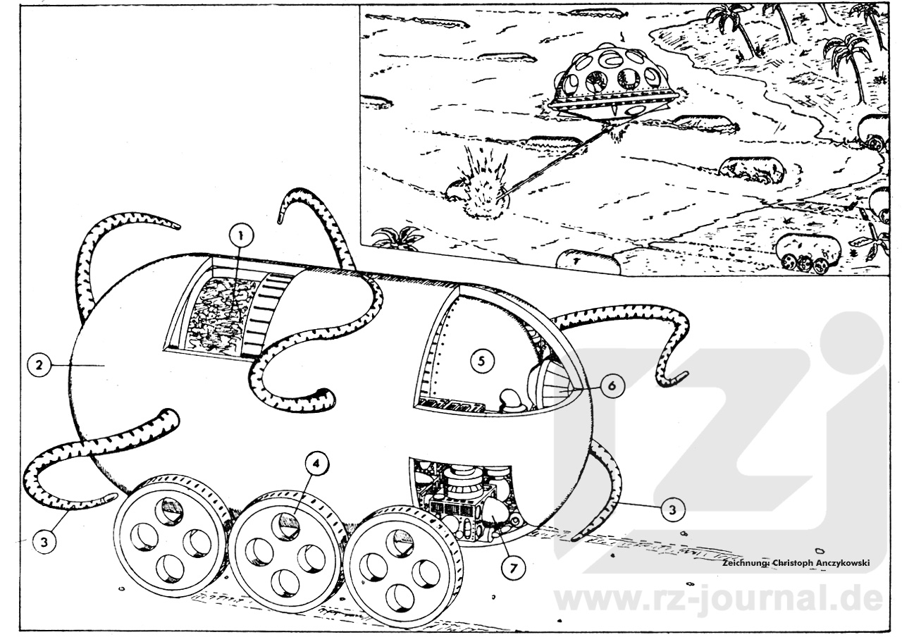 Abmessungen: Länge ca. 7 Meter, Durchmesser ca. 4 Meter; Durchmesser der Räder (6 Stück) 2 Meter. Auf eine weitere Beschreibung an dieser Stelle möchten wir verzichten, um Ihnen nicht die Spannung zu nehmen. Alle Erklärungen finden Sie in der Handlung des Romans. |