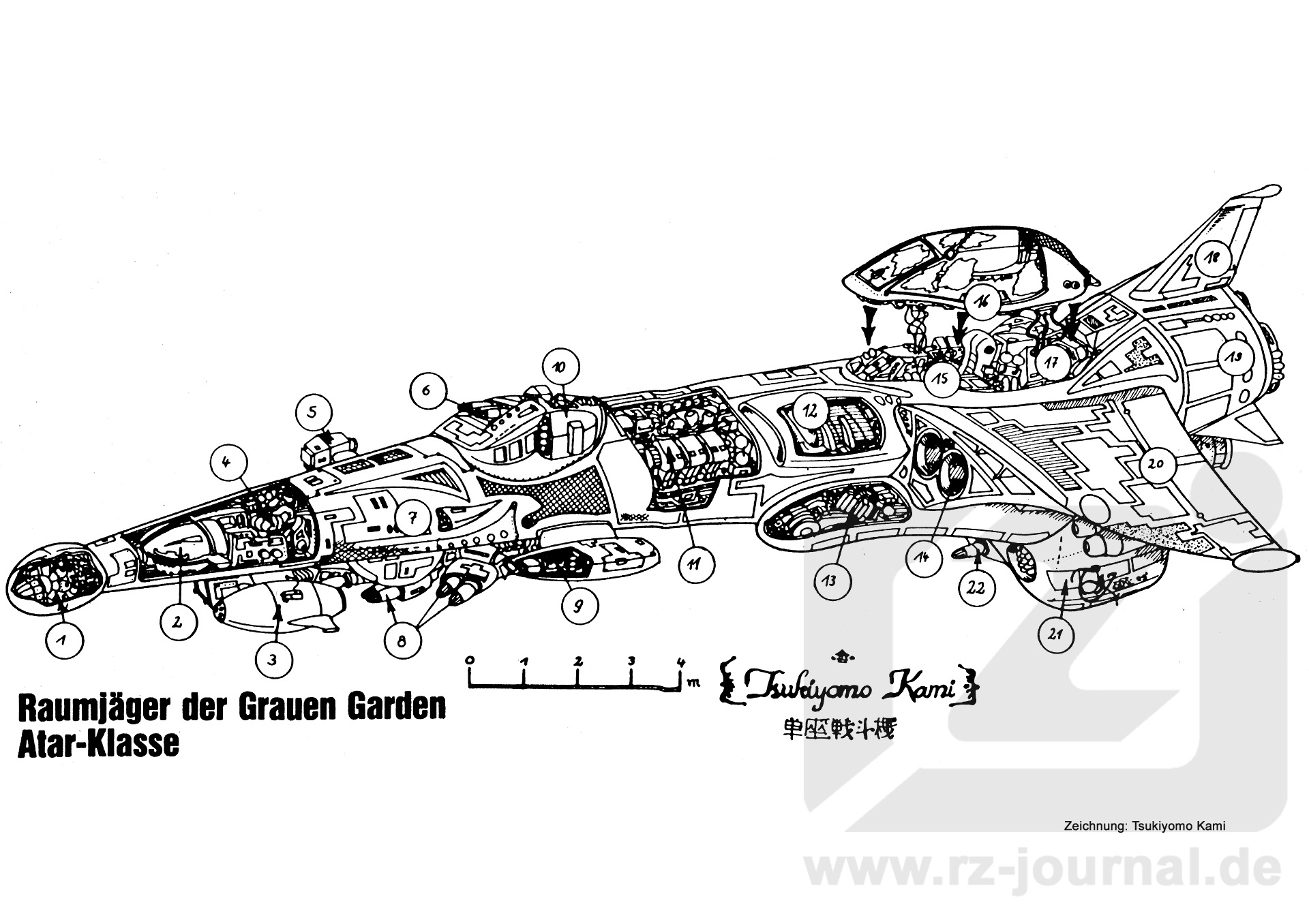 Raumjäger der Atar-Klasse werden von den Grauen Garden zumeist auf Kampfschiffen benutzt. Auf Bodenstützpunkten sind die Jäger allerdings ebenfalls anzutreffen. Die Raumjägerflotte besteht aus ca. 1300 Einheiten. Diese technisch hochkomplizierten Kampfmaschinen werden von Zeit zu Zeit modernisiert und umgerüstet. In Planung steht bereits ein Nachfolgemodell, das den Namen »Scherber« erhalten soll. Länge 24 Meter Spannweite 11 Meter Beschl. 452 km/sec2 Besatzung 1 Mann Kaiserkraft-Generator |
