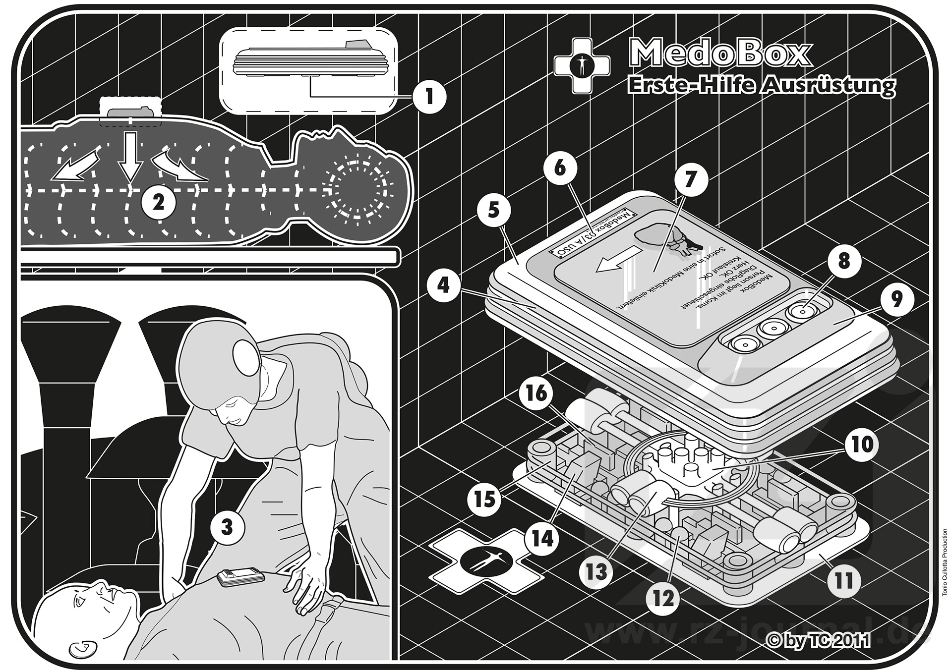 Bedienung der MedoBox: Verletzten oder Erkrankten wird sie z. B. auf den Bauch gelegt. Das Gerät erkennt ohne Anweisung den Metabolismus und erstellt selbstständige Diagnosen. Auf der Rückseite befinden sich sogenannte Porensensos. Diese ermöglichen die Kontaktaufnahme mit der Haut, danach werden Nano-Diagnoseroboter eingeschleust. Der Patient wird mit den sogenannten DiagRobs überflutet und sein Zustand innerhalb kürzester Zeit ermittelt. Der Diagnose-Bericht vor Ort erfolgt entweder per Sprachausgabe oder Holoprojektion. Gezielte Ratschläge der MedoBox unterstützen den nicht fachkundigen Ersthelfer bei der Notfallversorgung. Medostationen in der Nähe erhalten die Patientendaten über Funk und können somit die weitere Versorgung vorbereiten.