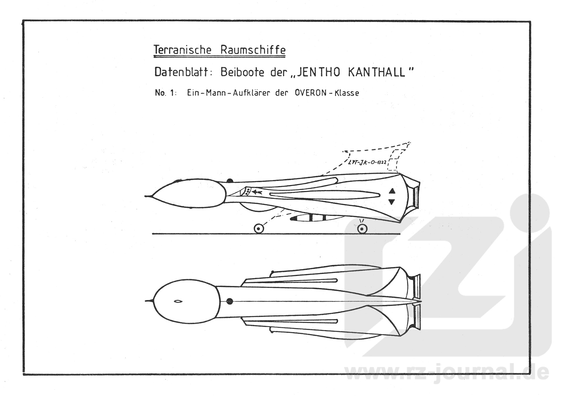 Datenblatt: Beiboote der „JENTHO KANTHALL“ No. 1: Ein-Mann-Aufklärer der OVERON-Klasse Kategorie: Leichter Raumaufklärer. Abmessungen: Länge 15 m, Breite 4,20 m, Höhe 2,90 m. Masse: 32 000 kg (leer). Antrieb: 2 gekoppelte Nug-Protonenstrahl-Triebwerke, getrennt schaltbar, leichtes Gravo-Triebwerk, ein Linear-Überlichttriebwerk. Leistungen: Maximalbeschleunigung 1200 km/s2 (-122323 g), Gesamtreichweite 115 Lichtjahre. Bewaffnung: 1 Energiewandler leichter Kapazität für Paralyse, Impuls- und Desintegratorenergie, ein Abstrahlprojektor, leichte Prall-, Hü- und Paratronschirme. Besatzung: 1 Mann. Bemerkungen: Dieser Raumaufklärer gehört zur neuen Generation von Raumschiffen, die für das Modernisierungsprogramm der Liga Freier Terraner konstruiert wurden. Bei diesen neuen Modellen kommen verstärkt die neuen Erkenntnisse in der Energie- und Gravotechnik zum Einsatz. So werden bei diesem Modell je nach Bedarf aus Formenergie die Tragflächen gebildet. Eine weitere Neuerung ist das Waffensystem, wo von einem einzigen Projektor sämtliche energetische Strahlen abgestrahlt werden können. Der Projektor wird von einem Energiewandler gespeist, der die zur Verfügung stehende Energieart in die gewünschte umformt. |