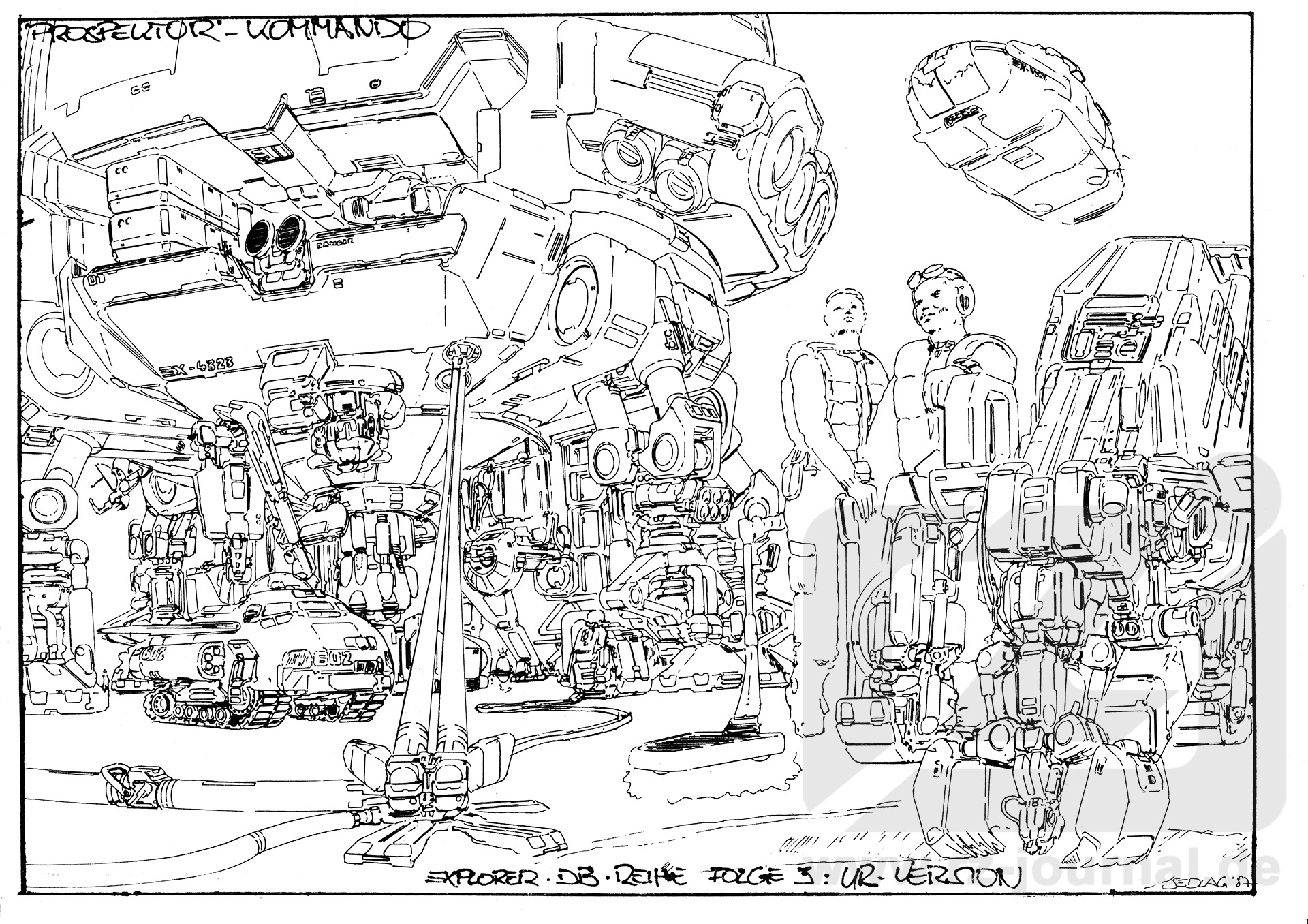 Wie schon in der ersten Folge dieser Serie erläutert, liegen die Vorteile eines Kombinations-Trägerschiffes, wie es sich mit der EX-4323 (siehe auch: entsprechenden PR-Band/PR-Report angeben) präsentierten der Fähigkeit , während eines Forschungsfluges gleich mehrere ganz unterschiedliche Forschungsaufgaben in unterschiedlichen Disziplinen auf einem wissenschaftlichen Niveau zu bearbeiten, wie es bisher nur durch diverse spezielle Forschungskreuzer unter erheblichem Mehraufwand möglich gewesen ist. Hier ist also die auf Prospektionseinsätze aller Art spezialisierte 60-Meter-Korvette EX-4323/C-6 während eines Landeeinsatzes auf einer öden B-3-Welt mit Sauerstoffatmosphäre zu sehen ,wobei deutlich das modifizierte Unterschiff mit fest verankerbaren Landebeinen, Bohrgestänge konventioneller Machart für tektonische Präzisionsmessungen sowie Desintegrator-Ausschachtanlagen zu erkennen ist. Im Gegensatz zu den fünf Schwesterbeibooten sind bei der EX-4323/C-6 jedoch auch umfangreiche Änderungen im Triebwerksbereich vorgenommen worden. Anstelle der kompakten Triple-Abstrahlgondel mit Schubumlenkeinrichtungen auf feldenergetischer Basis sind hier mechanisch schwenkbare Triebwerkseinheiten höherer Schubkraft eingebaut, die dem Prospektorraumschiff auch die Landung auf Extremwelten der Hochdruck-Ultraschwerkraft-Kategorie erlaubt, da unter den dort herrschenden atmosphärischen Bedingungen die normalerweise verwendete feldenergetische Schublenkung nicht mehr funktioniert. Die Möglichkeit zur Landung auf solchen unwirtlichen Extremwelten wird für ein Prospektionsschiff vor allem deshalb notwendig, weil verschiedenste seltene und lohnende Rohstoff-Vorkommen nur unter diesen außergewöhnlichen Umweltbedingungen anzutreffen sind. Bekanntestes Beispiel ist hierfür das nur auf Maverick vorkommende Ynkeloniurn, das im Raumschiffbau Verwendung findet; jedoch auch die wichtigsten Howalgoniumfunde wurden bisher vor allem auf Extremwelten getätigt. Diese Schwingquarze mit Vario-Konstante sind auch der Grund für die Landung des Prospektorkommandos auf der eigentlich uninteressanten Ödwelt, da bei Strahlungsmeßungen im 5-D -Spektrum auf ein solches Vorkommen spekuliert worden ist. Dies wäre für einen Planeten der hier gezeigten Kategorie absolut ungewöhnlich, wie es sich auch schon kurz nach der Landung des Kommandos herausstellt. Anstelle hochwertigen Howalgoniums stößt man auf unterwertige Triwalgitkristalle in allerdings ungewöhnlich reiner Form. Im Mittelgrund der Zeichnung erkennbar wird ein Experiment mit einer ausgesuchten Kristallstruktur vorbereitet, wo durch Quintronenbeschuß das Triwalgit zu einer höherwertigen Schwingungskonstante aufgeladen werden soll. Das Experiment soll Aufschluß geben über eine mögliche kommerziell. Nutzung als Howalgonium-Ersatz. Drei mobile HÜ-Schirmprojektoren sind zum Schutze der umliegenden Einrichtungen um die Versuchsanordnung gruppiert. Die Leitung des Experiments erfolgt durch das mobile Containerprospektorium (hinter dem Einsatz-Shift, unbewaffnete Variante eines normalen Typs der solaren Flotte), das gleichzeitig auch Grundstock für eine bleibende unbemannte Forschungs-und Beobachtungsstation sein kann. Im Hintergrund wird durch eine Traktor-Kleinst-Space-Jet ein weiterer Container aus der EX 4323/C-6 entladen. Bei dem im Vordergrund befindlichen Gefährt handelt es sich um einen Universal einsetzbaren Prospektorrobot mit drei verschiedenen Auslegern zu unterschiedlichen Bearbeitung verschiedenster Materialien, rechts z.B. ein Intervallbohrer zur Zertrümmerung auch massivster Objekte. Dieser robuste und vielseitige Einsatzroboter ist praktisch eines der Standardausrüstungsgegenstände eines jeden Prospektionskommandos der Explorerflotte, dessen Aufgabe natürlich nur die Erforschung und nicht der grobmaßstäbliehe Abbau von Rohstoffen sein kann. Insofern ist dieses Kommando nicht mit herkömmlichen kommerziellen Abbauschiffen vergleichbar^ liegt auch oft die exo-archäologische Untersuchung bei der Auffindung von Relikten vergangener Kulturen auf zu erforschenden Welten bei Spezialisten dieses Kommandos, dessen Ausrüstung auch solchen hochsensiblen Aufgaben gewachsen ist. |