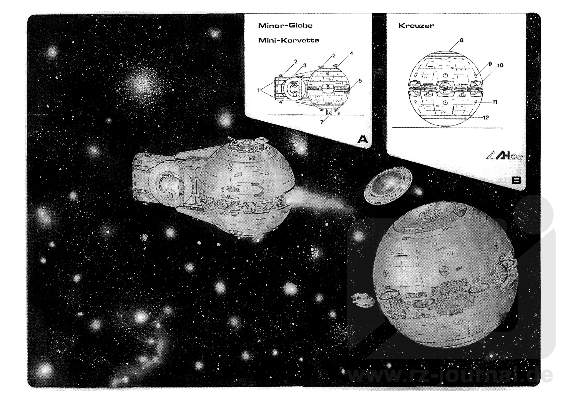 Die Freihändler haben auf PHÖNIX, einem Planeten des Ceres-Systems ihre Basis eingerichtet. Die Organisation wird von Roi Danton und Ronald Tekener geleitet, dessen Aufgabe es ist, die Milchstraße von ihren Besetzern zu befreien. Für diese Aufgabe stehen den Freihändlern elf der modernsten Raumschiffe zur Verfügung, die von unterschiedlichster Bauart sind. Eines dieser Raumschiffe ist die TORTUGA. Die TORTUGA ist ein moderner 200 Meter durchmessender Kugelraumer der CARRIER-Klasse. Die Namensgebung stammt von einer berühmt-berüchtigten Piratenfestung aus dem 16. Jahrhundert. Die TORTUGA ist auf der rechten Bildhälfte der Zeichnung zu sehen. Der Kreuzer zeigt den neuen Standard derterranischen Raumschiffe. Auffallend bei dem Kugelraumer ist der in der Äquatorebene befindliche zirkulare Hangarring, dessen Aufnahmekapazität für 6 Mini-Korvetten und 6 Space-jets (30 Meter Durchmesser) ausgelegt ist. Die Beiboote schweben im Hangarbereich auf Prallfeldem. Die Einsatzflexibilität des Kugelraumschiffs wird noch durch einen auf dem Nordpol angedockten Einsatzdiskus der Space-Jet-Familie vergrößert. Dieser Diskus ist wie dieTORTUGA selbst mit einem modifizierten Metagrav-Antrieb ausgerüstet Die Besatzung setzt sich aus 200 Mitgliedern der Freihändler zusammen, wobei 30 Mann die Schiffsführung bilden. Die Kommandospitze bildet eine zehnköpfige Gruppe von Draki- sten, eine Clique innerhalb der Organisation der Freihändler. Die Organisation leitet ihren Namen von dem legendären Freibeuter des 16. Jahrhunderts, Sir Francis Drake, ab. Weitere 30 Techniker sind für die Instandhaltung der TORTUGA verantwortlich. Die restlichen 140 Besatzungsmitglieder bilden die Einsatzeinheiten für die zahlreichen Beiboote der TORTUGA. Bis zu 400 Mann kann die Schiffszelle derTORTUGA noch zusätzlich aufnehmen. Auf der Darstellung sieht man den 200-Meter-Kreuzerbei dem Ausdocken seiner Beiboote. Links von der TORTUGA befindet sich eine Mini-Korvette der MINOR-GLOBE-Klasse, eine terranische Neukonstruktion, in der Beschleunigungsphase, Die MINOR-GLOBE- Schiffe bestehen aus einer 30 Meter durchmessenden Kugel und einem angeflanschten Antriebsblock. In der Kugel befindet sich der Leitstand, Wohn- und Aufenthaltsräume, Frachtkammem und ein Roll On/Roll Off- Hangar. Der Antriebsblock beinhaltet neben den beiden Metagrav-Triebwerken noch eine Schleusen- und Docksektion für zwei außen angekoppelte Starlifter-Raumer. Die Mini-Korvette hat eine Länge von 53,5 Meter. Die Vielfältigkeit und die Effizienz dieses Schiffes ist größer als die einer 50 Meter Space-Jet, bei nur halb so großem Hangarraumbedarf, Mit einer Besatzungsstärke von 3-15 Raumfahrern ist die Einsatzfähigkeit des Räumers komplett. |