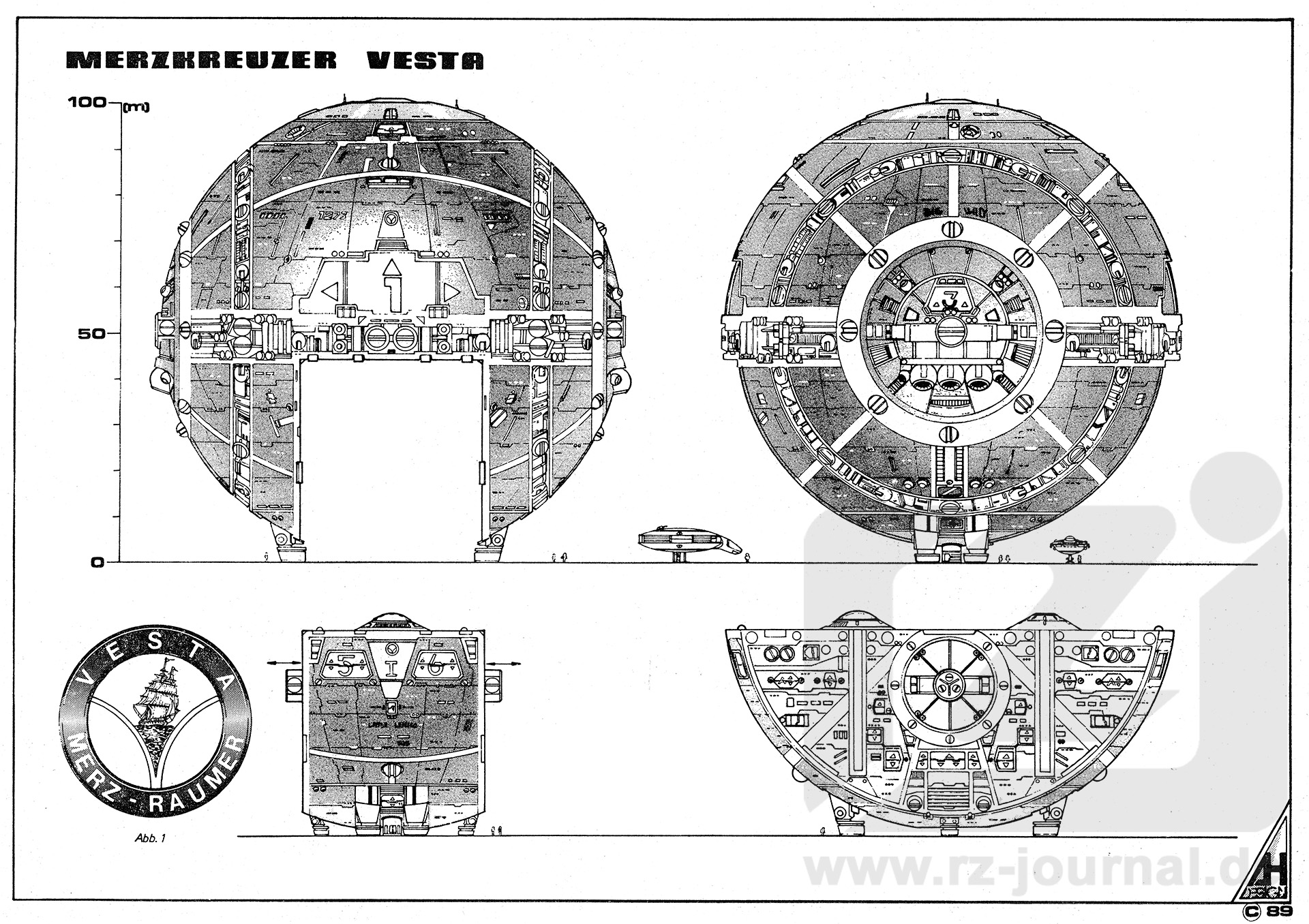 2. Allgemeines: Die Grafik zeigt die Konstruktionszeichnung des 100m durchmessenden MERZ-Kreuzers der Vesta-Klasse. Das wichtigste Merkmal dieser Mehrzweckkugel ist die knapp unter dem äquatorialen Aggregateband befindliche MERZ-Bucht liegt ein verschließbarer Roll-on-Roll-off-Hangar. Die 40m breite MERZ-BUCHT dient zur Aufnahmen von Modulen, die den Raumkreuzer für seine jeweilige Aufgabe spezifi- zieren. Mit Hilfe der verschiedenen Module wird ein großes Einsatzspektrum erzielt. Ohne Modul läßt sich in der MERZ-BUCHT sperriges Material transportieren, welches mittels Fesselfelder und Traktorstrahlen in der MERZ-Bucht bzw. Modul-Bucht gehalten wird. In der äquatorialen sowie in den beiden ortoäquatorialen Aggregatbändern befinden sich neben den Metagrav-Antrieben auch die defensiven und offensiven Verteidigungsanlagen. Auf der unteren Hälfte des Datenblattes ist das Kreuzer-Modul abgebildet. Über die verschiedenen Module und deren Technik wird im nächsten Teil dieser DB-Serie ausführlich berichtet. Die Abbildung 1 zeigt das Logo des MERZ-Raumers der Vesta-Klasse. ZUm Poster: Der MERZ-Raumer EIDOLON ist im Anflug auf die Kunstwelt Wanderer2. Aus einem Hangar wird eine Kleinst- Space-Jet für einen Exkursionsflug ausgeschleust.