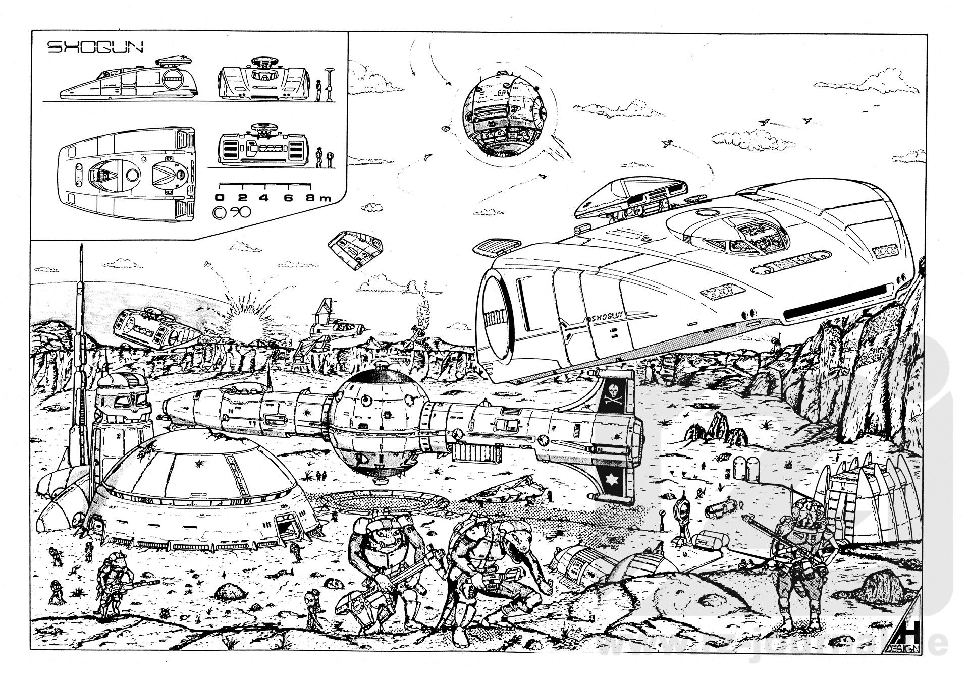 Allgemeines: Im Jahre 1260 NGZ wurde nach Ideen von Reginald Bull die ersten Überlegungen zu einem neuen Shift-Konzept erstellt, welche die Eigenschaften von einem SAMURAl-Shift und dessen Stealth-Vereion NINJA vereinen sollte. Das Projekt erhielt den Codenamen SHOGUN. Viele Pflichten mussten die Konstrukteure bei der Entwicklung berücksichtigen. Zu den gestellten Anforderungen zahlten spezielle Tarnvorrichtungen und ein völlig neuartiges Antriebssystem, welches für den Stealth-Einsatz konzipiert werden sollte. Mit diesen Anforderungen setzen die Raumschiffkonstrukteure im Jahre 1262 NGZ Ihre Vorstellungen in die Realität um und entwickelten eine kettenlose Gleiterkonfiguration, die alle Eigenschaften seiner Vorgänger beinhaltet. Eine Vielzahl neuartiger Formen kreierten die Designer für den SHOGUN. Die Ingenieure entschieden sich für eine aerodynamische Form. um eine bessere Manövrierfähigkeit bei Flugeinsätzen innerhalb der Atmosphäre zu erhalten. Für den Stealth-Einsatz entwickelten die Werkstoff-Ingenieure einen chromatischvariablen Komposit-Verbundwerkstoff, der beim Implantieren von Informationsmustern jede Farbstruktur annehmen kann. Die ganze Außenhaut des Flugpanzers ist mit einer Vielzahl von Kompositzellen beschichtet. Über eine syntrongestützte Kameraperipherie können dann Informationen in die Werkstoffstruktur gebracht werden, welche wie bei einem Chamäleon, die Außenhülle der Umwelt anpasst. Diese neukonstruierte Chamälion-Stealth-Einrichtung ist vollkommen emisionsneutral. Auch auftreffende Tastimpulse von Ortungseinrichtungen werden von der Außenhülle absorbiert. Bei der Triebwerkswahl entschieden sich die Konstrukteure für den Gravopuls-Antrieb und das ebenfalls neuentwickelte Innerpuls-Triebwerk. Beide Antriebssyteme sind für den Flug im Vakuum und in der Atmosphäre geeignet. Die stärkeren Gravopuls-Antriebe verschaffen dem Flugkörper im Wettraum eine durchschnittliche Reisegeschwindigkeit von 144000 km/s. Das leistungsschwächere, emissionsarme Innerpuls-Triebwerk ist eine Kombination aus einem modifizierten Feldantrieb und einem Invertions-Pulskompensator, welches während eines Stealtheinsatzes den SHOGUN antreibt. Der Innerpuls-Antrieb wird über zwei, an den Seiten sitzenden Projektionspole emittiert. Über selbe Projektionspole werden auch die dreifach gestaffelten HÜ- und Paratronfelder erzeugt. ein MHV-Geschützturm mit Transformkanone und vier Raketenwerfer sind die Waffen des Shift Der SHOGUN-Shift wurde im September 1265 NGZ erstmalig auf der IRON-THUNDER, einem Merzraumer der 400-m-Klaase eingesetzt.
