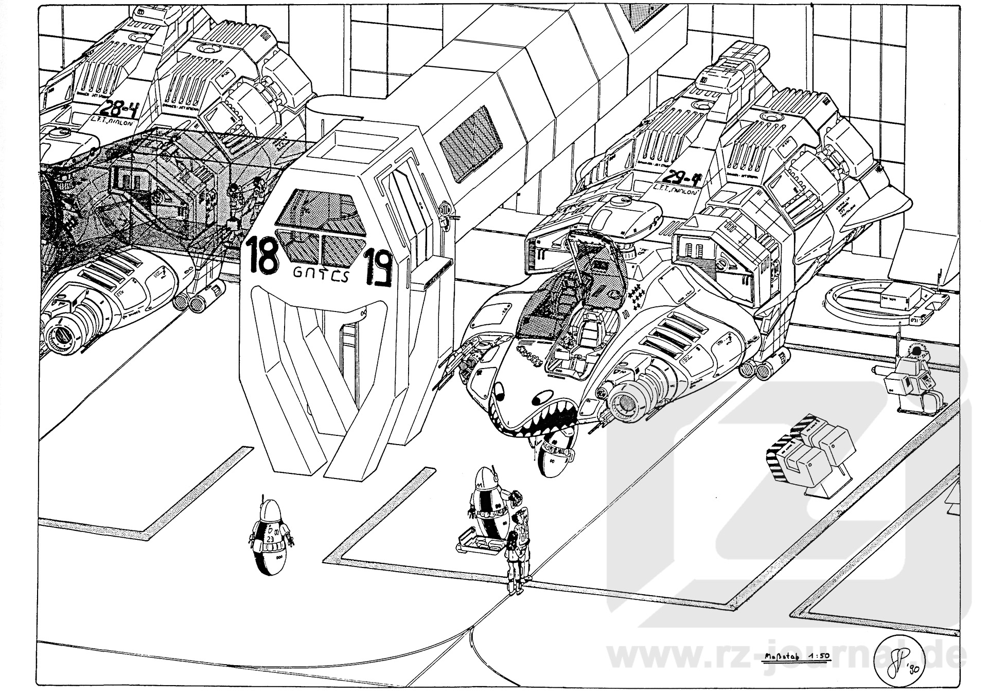 Die Großzeichnung zeigt 2 NIMROD-Maschinen in gedockter Position auf ihrem Parkdeck. Ein Dock besteht aus einem Prallfeldprojektor für das Hovorfeld, einem Versorgungs- und Checkterminal und dem Gate, der Zugang für die Piloten. Er gewährleistet der Besatzung ein Besteigen der Maschine, auch wenn der Hangar entlüftet würde. Gate 18 ist hier aktiv, man sieht die Formenergiegangway sowie 2 Piloten in SERUNS. Zum Wartungsstab der Maschinen gehören je 3 (wie in der Zeichnung) Wartungsrobots. Sio werden über die Servicesyntronik des jeweiligen Geschwaders koordiniert. die wiederum ihre Informationen über Bordsyntron und Checkterminal erhält. Pro Schwarm (10 Maschinen) sind noch 4 Techniker verteilt; 1 Geschwader = 3 Schwärme = 30 Maschinen. Die auffällige Bemalung und Benennung Ist ein traditionelles Verfahren noch aus der Zeit der Organisation WIDDER. Die Flottenführung hat dagegen nichts einzuwenden, sofern diese „Manie" nicht allzu sehr ausartet. Die gesamte Szenerie spielt im Unterdeck des MERZ-Raumcrs AVALON. |
