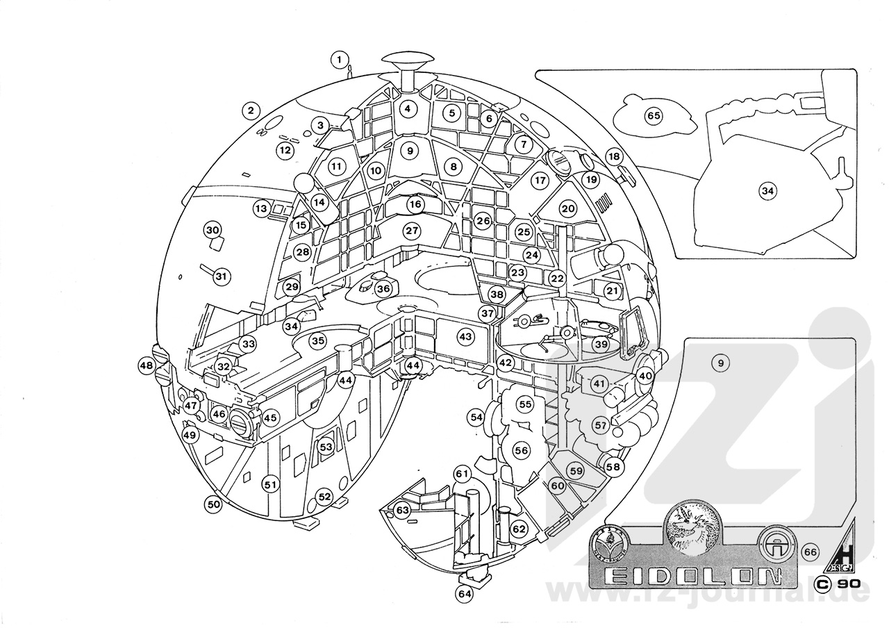 Allgemeines: Am 13. Oktober 1169. NGZ brachen Perry Rhodan und neun seiner Freunde zu einem Flug nach Wanderer auf. Von ES ging der Befehl aus, dass Perry Rhodan und seine Gefährten ihre Zellaktivatoren vor Ablauf der ursprünglichen Frist abzugeben hatten. Für den Flug zum Kunstplaneten wählte Perry Rhodan die EIDOLON, einen 100-Meter-Kreuzer der VESTA-Klasse aus. Raumkreuzer der VESTA-Klasse sind Mehrzweckeinheiten, auch kurz MERZ-Raumer genannt, die für die Erledigung eines grossen Einsatzspektrums konzipiert sind. Diese Allzweckraumer lassen sich mit Hilfe unterschiedlicher Merz-Module in eine Spezialeinheit umwandeln. Die Merz-Module werden in der knapp unter dem äquatorialen Aggregateband befindlichen Merz-Bucht verankert (siehe auch PRR 188/189). Diese Entwicklung bewirkte, dass sich die terranische Flottenstruktur innerhalb der 100-Meter-Klasse auf die Modellpalette des VESTA-Merzkreuzers mit mehr als 85 Prozent umstellte. Der 100 Meter durchmessende Merz-Kreuzer wird von einer Standardbesatzung von 87 Mann geführt, die zusätzlich mit rund 100 Spezialisten, Soldaten und Beibootbesatzungen ergänzt werden kann. Als Beiboote für die Besatzung werden 8 Kleinst-Space-Jets und zwei Shifts mitgeführt. Zusätzlich können im Roll ON/Roll OFF-Hangar noch zwei 30-Meter-SpaceJets aufgenommen werden. Für den Flug im superphotischen Bereich sorgen 6 METAGRAV-Triebwerke, welche eine Spitzengeschwindigkeit von 75 Millionen erreichen. Eine gleiche Anzahl von METAGRAV-Antrieben, weiche entgegengesetzt der Hauptflugrichtung des Raumschiffs installiert sind, werden für Brems und Steuermanöver eingesetzt. Durch diese Triebwerksanordnung wird ein hoher Beweglichkeitsgrad erreicht. Der Überlichtfaktor der METAGRAV-Triebwerke beträgt 75 Millionen und die maximale Beschleunigung liegt über 930 km/s2. Impuls und Antigravtriebwerke unterstützen die Metagrav-Triebwerke bei Start und Landung des Kreuzers. Der Kreuzer schwebt nach der Landung auf einem Prallfeld. Lediglich über die vier beweglichen Landestützen, deren ursprüngliche Aufgabe die Fixierung der Merzmodule ist, stellen den Bodenkontakt dar. 18 Transformkanonen und 22 Desintegratoren steilen die Haupt-Offensivbewaffnung dar fünffach gestaffelte Paratron- und HU-Schirme und Absorberfelder schützen die Kugel vor externen Einflüssen. Zusätzlich gehört ein VIRTUELL-IMAGER Ortungsschutzsystem mit zur Ausrüstung, weiches in der Lage ist, eine Energieblase eines beliebigen Räumers einschliesslich deren Funk- und Triebwerksemissionen an sine beliebige Stelle im Weltraum zu projizieren. |