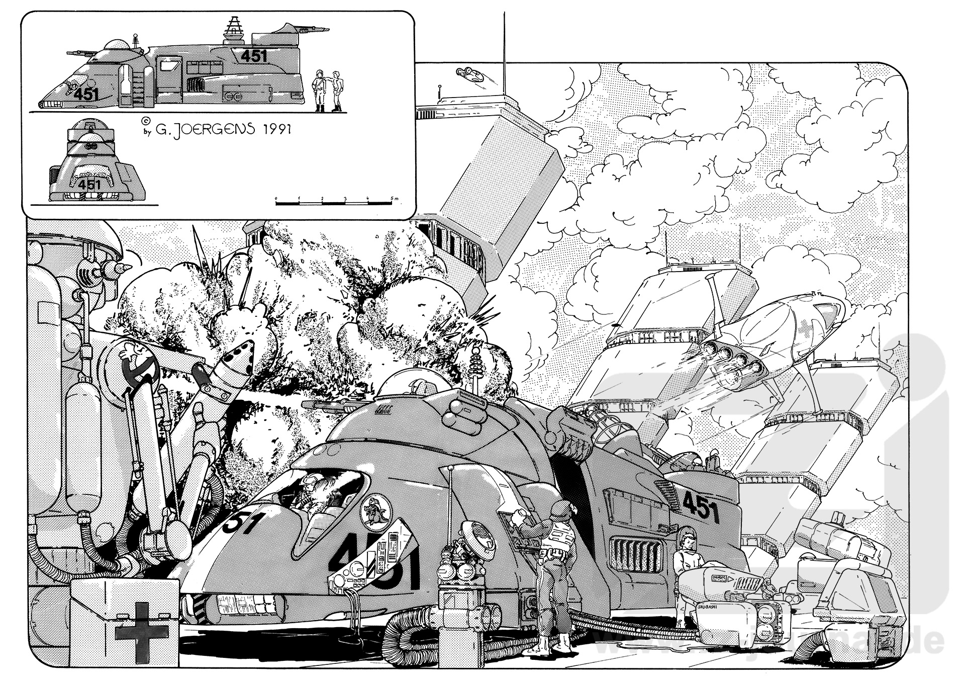 Technische Daten: Länge: 11.5 m Breite: 4,2 m Höhe ohne Aufbauten: 2,8 m öhe mit Aufbauten: 4,2 m Masse: 47,6 x 104 Höchstgeschwindigkeit: 195 km/h Antrieb: Antigrav und Innenstrom-Jettriebwek Besatzung: 1 Pilot 3 Energie-Techniker 2 Chemo-Techniker 6 Feuerlöschroboter vom Typ TKR 2800/ VI Sonstiges: Das Datenblatt zeigt eine typische Einsatzsituation, in der es trotz brisanter Lage nicht zu hektischer Betriebsamkeit kommt, da der "FLZ 451" eine solche Situation gut unter Kontrolle bringen kann. Im Vordergrund erkennt man einen der Feuerlöschroboter vom Typ TKR 2800/ VI; welche zumeist aus Kampfrobotern umgebaut werden, da deren starke Defensivschirme einen gute Basis für einen solchen Einsatz bedingen; mit einer Hochdruck-Löschkanone und mehreren Löschmitteltanks auf dem Rücken in Wartestellung. Die Besatzung hat die mobilen Energie-Zapf-, und Schutzschirmprojektoren aufgebaut und somit das Umfeld von Hitze-, und energetischer Streustrahlung abgeschattet. Ein Energie-Techniker in einem geschlossenen Thermoschutzanzug modifiziert gerade einen Schutzschirm-Projektor während sein Kamerad in leichter Schutzkombi die Energiezufuhr am zentralen Bedienpult regelt. Ein zusätzlich aufgestellter "Transmitter-Hydrant" wurde zwar angeschlossen, aber noch nicht benötigt. Der Pilot überwacht vom Cockpit aus den gesamten Energiefluss und zugleich die über Sensoren ausgewerteten Daten über den Brandherd um die geeigneten Maßnahmen koordinieren zu können. Einer der beiden Multi-Twin-Hochdruckkanonen in ihren beweglichen Türmen versprüht gerade ein Stickstoff-Löschschaumgemisch während der in hinteren Bereich befindliche Thermoenergie-Zapfstrahlprojektor einen Teil der Hitze für die Energieversorgung abzapft. Die hintere Hochdruckkanone arbeitet mit einem speziell für diesen Fall eingebauten Energiedestruktor um so die freigewordene Hyperenergie aus der Zentralpositronik zu neutralisieren. Der vorsorglich georderte Rettungsgleiter vom Typ CERES kann zum Glück ohne Einsatz wieder starten und zur Einsatzbasis zurückkehren.