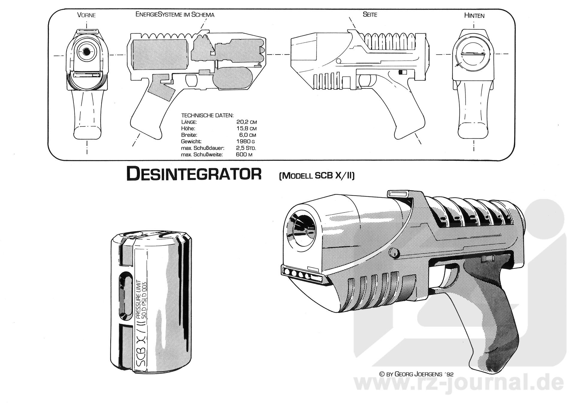 TECHNISCHE DATEN: Desintegrator - Modell SCB X / II - (Single - Combat - Blaster X. Version der IIer-Serie) Maße: 20,2 x 15,8 x 6 cm Gewicht: 1980 g max. Schußdauer: 2,5 Stunden mit 1 Energiemodul max. Schußweite: 600 m, abhängig von den Energiewerten des Energiemoduls