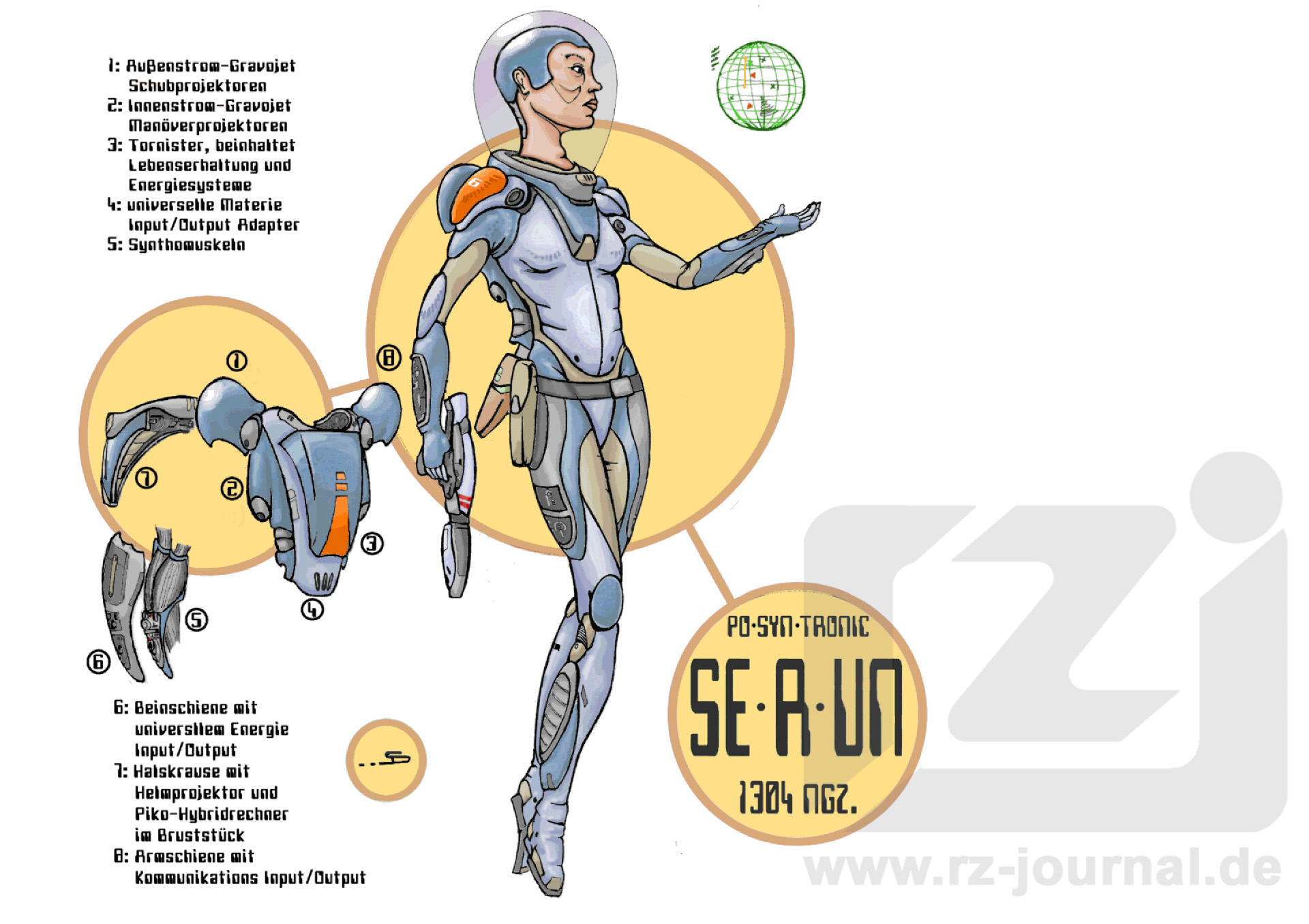 30 Zentimetern Größenunterschied getragen werden kann. Die interessanteste Neuerung ist der Hybridrechner als Ersatz für den Pikosyn. Statt wie bisher zwei getrennte Rechner mit einer Korra-Vir-Prüfschleife einzusetzen, wofür der Platz im Bruststück des Anzugs nicht ausgereicht hätte, wurden so genannte Parallelbauteile eingesetzt, die ihre Funktion im positronischen wie auch im syntronischen Format erfüllen können. Der neue SERUN überzeugt aufgrund der relativ einfachen Konstruktion in vielen Anwendungsbereichen. Mitbewerber des Herstellers PoSynTronic boten jedoch schon wenige Monate nach der Präsentation Modifikationen an. Text & Zeichnung: Sascha Döpper |