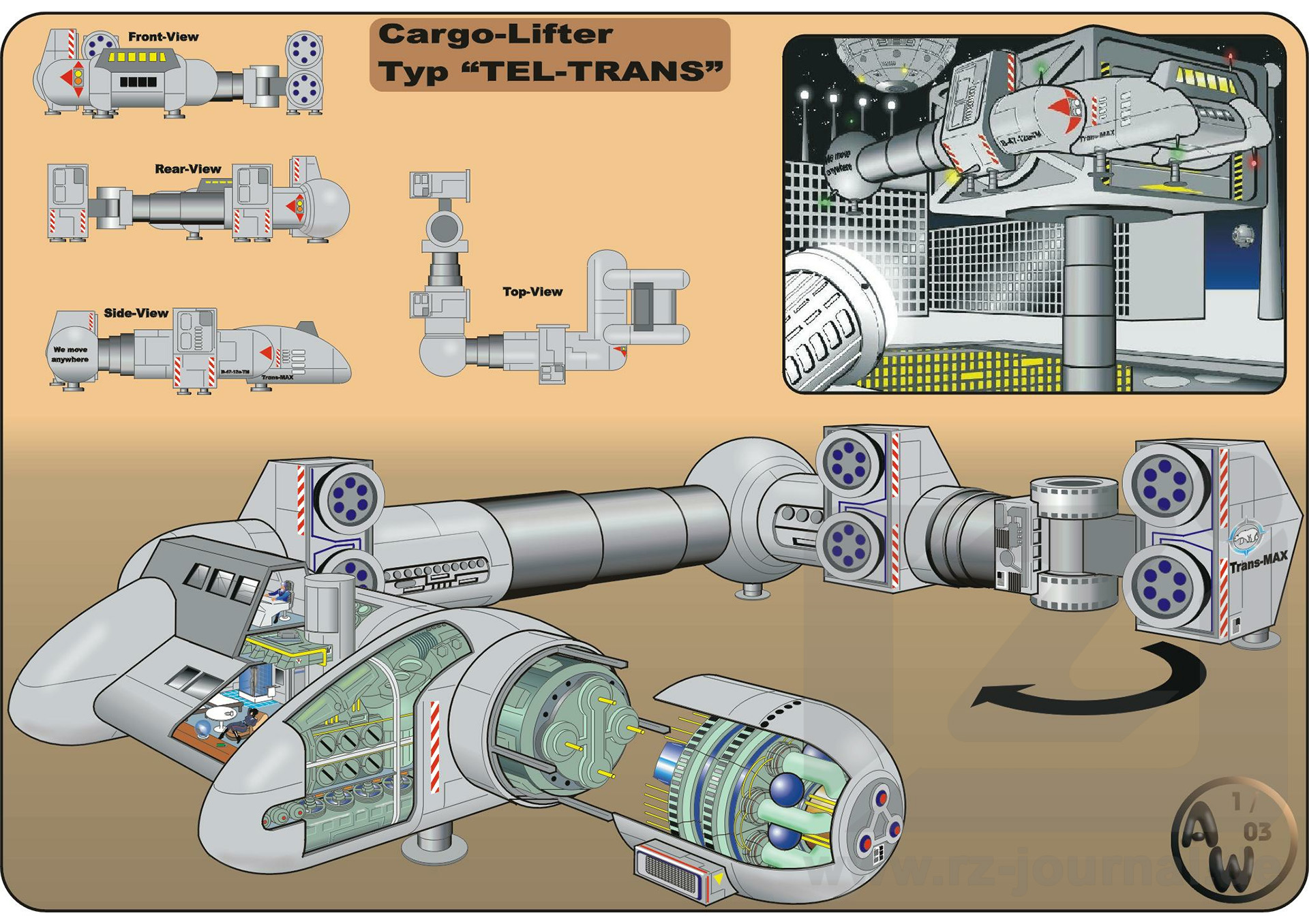 Der Name des Schleppers leitet steh von »Teleskop« ab; der TEL-TRANS kann in Länge und Breite variieren und verschiedenste Containerformate sicher umschließen. Verankert wird die Fracht gravomechanisch. Ähnlich dem TIFI-TRANS ist die oberste Maxime auch hier die Wirtschaftlichkeit. Der Mannschaft steht demzufolge nur minimaler Raum zur Verfügung - im Prinzip das Cockpit und ein kleiner Wohnraum darunter. Alle übrigen Bereiche des Schiffs sind der Besatzung nur über Kriechgänge zugänglich. Andererseits kann der Schlepper modular aufgerüstet werden. Im Normalfall befindet sich in Flugrichtung links der Brücke ein »eingeschraubter« Gravitrafspeicher. Dieser Abschnitt der Rumpfstruktur kann durch einen längeren ersetzt werden, mit dem Überlichtflüge bis zu 500 Lichtjahren möglich werden. Das genügt, um auch umliegende Systeme zu beliefern. Im Bild ist rechts oben eine Verladeszene dargestellt. Ein hydraulischer Frachtheber hat gerade einen Container aus einem Tieflager herausgehoben. Der Schlepper dockt seitlich nach links (in Flugrichtung) an. Durch die Verlängerung oder Verkürzung der Rumpfstruktur mittels hydraulischer Teleskopelemente wird der Container praktisch integraler Schiffsbestandteil. Die Risszeichnung zeigt einen modifizierten TEL-TRANS. Er erhält an seiner Backbordseite gerade ein Metagrav-Modul. Innenbords am Schiff ist der zuvor eingesteckte Gravitrafspeicher zu sehen. In der dem Betrachterzugewandten Finne befinden sich der Gravopuls-Antrieb (oben) und die Antigrav- bzw. Bordschwerkraftanlagen (unten). Das Zwischenstück birgt den Wohnbereich, den Treppenschacht zum Cockpit sowie nach außen und die Steuerzentrale.