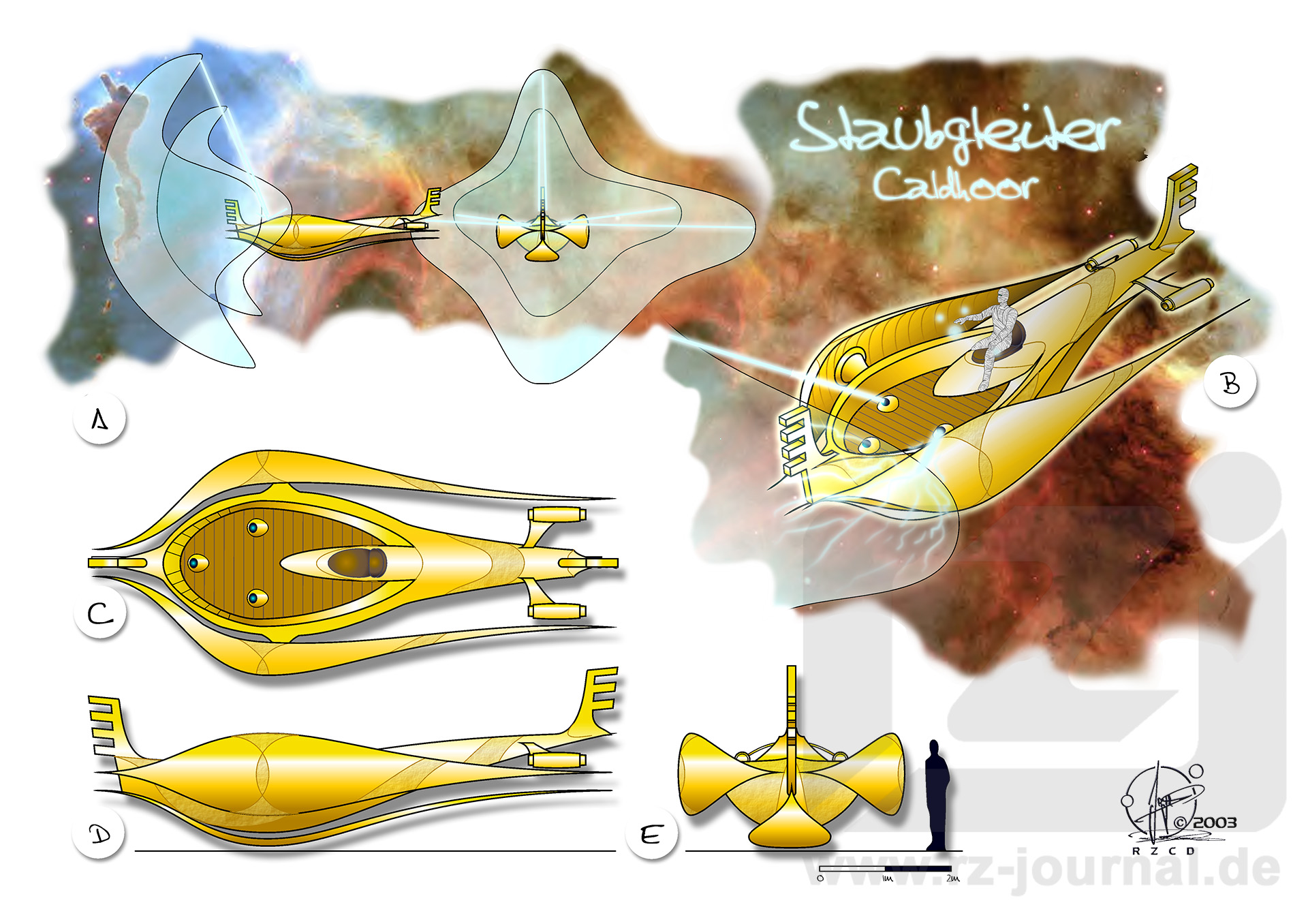 Allgemeines: Innerhalb des Caldit-Systems ist Raumfahrt im herkömmlichen Sinn nur auf einem höchst einfachen Niveau möglich. Primitive Boote können zwar das System durchfliegen, aber der Einsatz hoch entwickelter Technik bleibt ausgeschlossen. Doch Primitivität kommt für die Vaiani-schen Ingenieure nicht in Betracht. Daher stellt ihre Lösung vermutlich das originellste Konzept von Raumfahrt in der Galaxis Tradom dar. Neben den großen Staubseglern durchkreuzen vor allem Staubgleiter die Calditische Sphäre. Sie entstammen der gleichen Technologie wie die Staubreiter und sind eine Mischung aus surfbrett- und gondelähnlichen Gefährten, mit denen sich die Leuchter durch das Caldit-System bewegen. Die Staubgleiter verfügen über drei Projektoren, aus denen vom Gondelboden mehrere goldene Strahlen nach oben dringen und sich zu einem dreieckigen, halb transparenten energetischen Feld, dem Parasegel, vereinigen. Die Staubgleiter machen sich ebenso wie die Staubsegler die strudelartigen, einem mehrdimensionalen Ozean ähnelnden Hyperfelder des Systems zunutze, indem sie mit den Parasegeln ihrer Schiffe Hyperenergie in Vortrieb verwandeln. Der Segeleffekt ist dabei nur eine physikalische Nebenwirkung, tatsächlich basiert die Vortriebswirkung auf einem Abstoßungseffekt. Komplizierte Steuerinstrumente oder Uberwachungs-systeme gibt es nicht. Ein Leuchter kann mit Hilfe seiner Hyperfühligkeit den Kurs des Staubgleiters durch die Calditische Sphäre erspüren. Einzig eine virtuelle Vorrichtung zur Justierung des Segels erlaubt dem Leuchter, seinen Kurs zu bestimmen. Für kleine Manöver ohne Parasegel verfügt der Staubgleiter über zwei Strahltriebwerke im Heck, die eine konventionelle Fortbewegung ermöglichen.