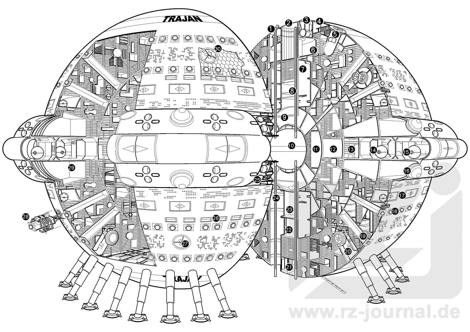 Die TRAJAN ist ein Kugelraumer vom gleichen Bautyp wie die legendäre MARCO POLO. Ursprünglich im Jahr 3459 n. Chr. als Ersatz für das alte USO-Flaggschiff IMPERATOR erbaut, wurde sie zunächst nicht in Dienst gestellt, sondern eingemottet, dann aber etwa seit 1300 NGZ von der Neuen USO reaktiviert und auf den technisch allerneuesten Stand gebracht. Die sehe aufwendigen Umbauten kosteten Unsummen. Das führte dazu, dass die TRAJAN erst im Jahre 1311 NGZ in Dienst gestellt werden konnte. Die TRAJAN dient der USO als mobiler Großträger für Kleinraumer und Ausweich-Hauptquartier, sollte Quinto-Center selbst gefährdet sein. Eine Stammbesatzung von 2000 Männern und Frauen ist erforderlich, um einen Drei-Schicht-Betrieb sicherzustellen, so dass die TRAJAN immer voll einsatzbereit ist. Weitere 4000 Männer und Frauen bedienen die Beiboote. Zusätzliche USO-Spezialisten und Besatzungsmitglieder können an Bord genommen werden, falls dies erforderlich sein sollte. Die TRAJAN ist mehrfach redundant ausgerüstet. Das umfasst alle Bereiche. Sie kann sich auf mehrere Arten überlichtschnell bewegen – mittels Metagrav, Lineartriebwerk oder Transitions-Sprungtriebwerk. Die Energieversorgung wird von vier großen internen Hypertrops, sechs kleinen Not-Hypertrops, sechs NUGAS-Kraftwerken und unzähligen Fusionsmeilern sowie durch den Prototyp eines Hyperraum-Permanentzapfers sichergestellt, als Zwischen- und Notspeicher dienen große und kleine Gravitrav-Speicher. Das Schiff ist in hohem Maße modular gestaltet worden. Fast alle alten Waffenkuppeln wurden entfernt. Stattdessen nehmen nun »Taschen« von rechteckigem Querschnitt die Waffenmodule auf. Alle Waffen haben genormte maximale Außenmaße und können demzufolge beliebig ausgetauscht werden. Lediglich beim überschweren Pol-Intervallgeschütz, dem »Affengift«, würde der Umbau geringfügig länger dauern, weil seine »Tasche« komplett ausgetauscht und Peripherieaggregate umgruppiert werden müssen. Um Modernisierungen und Umbauten zu vereinfachen wurde die fortschreitende Miniaturisierung der Technik und das enorme Volumen der Zelle genutzt, um sechs große Reparaturschächte in das Schiff einzuziehen, die von verschiedenen Stellen aus in verschiedenen Richtungen weit in das Schiff hineinreichen. Auch im Schiff verlaufen mehrere solcher großen Schächte. Die Kreuzerhangars werden ebenfalls zu diesem Zweck genutzt, so dass selbst große Aggregate tief aus dem Schiffsinneren, wie z. B. die zentralen Gravitrafspeicher, in einem Stück ausgetauscht werden können. Kein anderes Großraumschiff der Milchstraße kann der TRAJAN zur Zeit das Wasser reichen, was konventionelle Feuerkraft oder Umbauoptionen und -zeiten angeht. Durch ihre Variabilität kann sie der USO noch viele Jahre als Flaggschiff dienen. Kein unerheblicher Umstand, bedenkt man die Baukosten. Im Bild zeigt die TRAJAN gerade die typischen Charakteristika eines in Kürze bevorstehenden Alarmstarts. Die Impulstriebwerke laufen schon und die Metagravs sind aktivert und schillern demzufolge grünlich. |