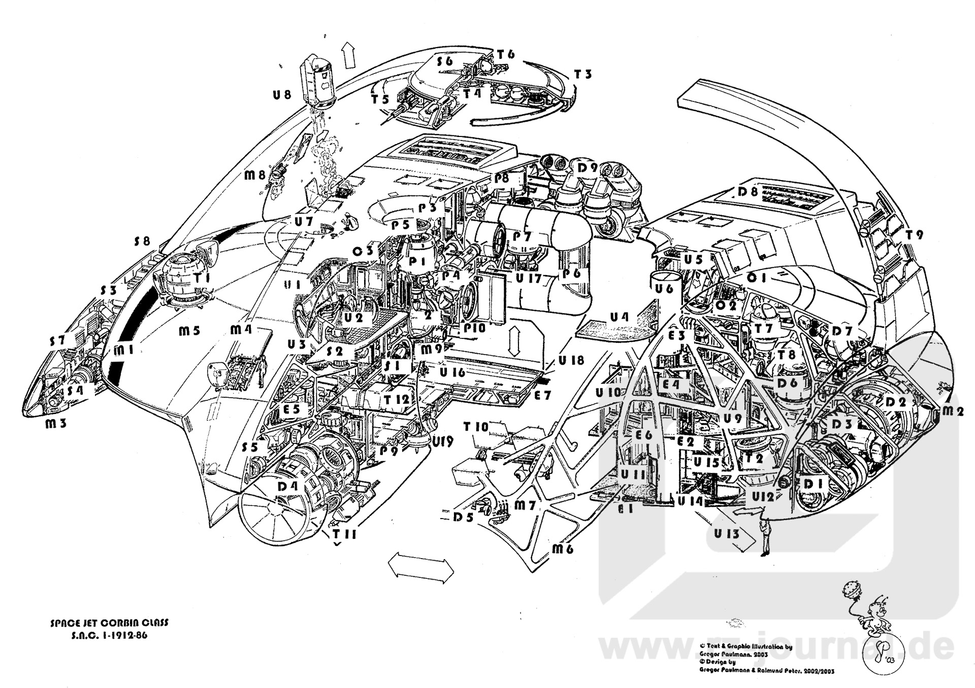 Antriebe D1 Hyperkon-Projektor für Beschleunigung D2 Hyperkon-Generator mit Antriebsspulen, Abschirmung und Kühlsystem D3 Avionik-Schnittstelle D4 Grigoroff-Projektorschüssel D5 Notfall-Stabilisierungsdüsen D6 Antigravgenerator D7 Antigrav-Projektorkugel (10) D8 Gravo-Jet, Generator für Außenstrombetrieb D9 Gravo-Jet, Innenstrom-Turbinenbeschleuniger und Düse