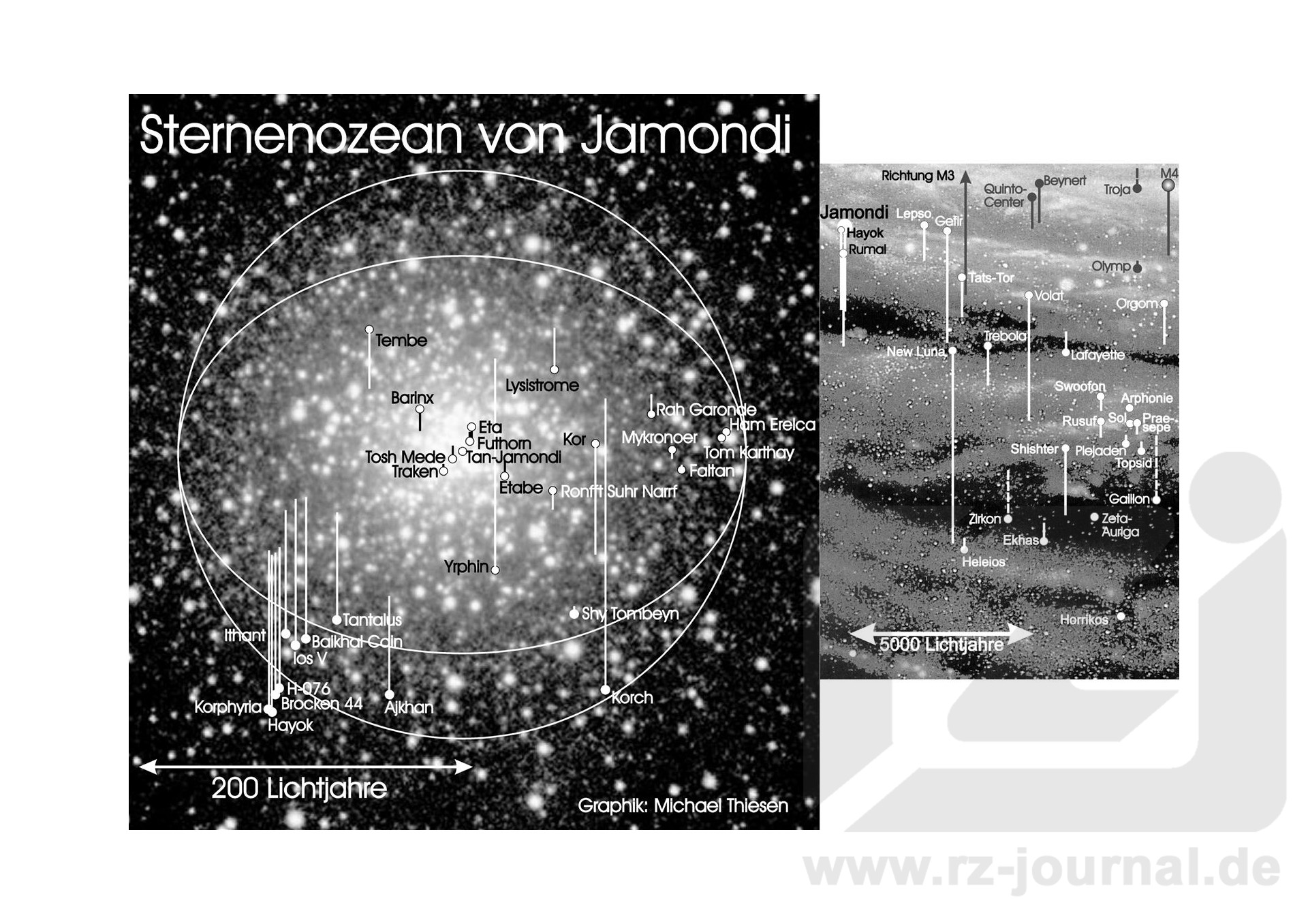 Wichtige Welten des Kugelsternhaufens Jamondi: Ajkhan: 143 Lichtjahre vom Zentrum Jamondis und 85 Lichtjahre von Hayok entfernt. Ewiges Asyl der Liebenden Schildwache Metondre seit der Blutnacht von Barinx (PR 2252). Ash Irthumo: 3. von 9 Planeten der gelben Standardsonne Ash; nur 0,6 Lichtjahre von Baikhal Cain entfernt (und daher auf der Karte nicht eigens eingezeichnet); Motana-Welt. Hierher brachte die Schota-Magathe-Familie Keg Delloguns Perry Rhodan, Atlan, Zephyda und Rorkhete nach dem Angriff der Kybb auf den Wald von Pardhan auf Baikhal Cain in Sicherheit (PR 2216 ff). Am 11. Januar 1332 NGZ stürzte der Planet zunächst ohne seine Sonne in den Normalraum. Mit Kunstsonnen sorgten die Terraner dafür, dass die Bewohner überlebten (PR 2226). Baikhal Cain: 1. von 5 Planeten der kleinen roten Sonne Cain; 131 Lichtjahre vom Zentrum Jamondis und 52 Lichtjahre von Hayok entfernt. Den Namen Baikhal Cain (Große Zukunft) erhielt der Planet, als die Mediale Schildwache Lyressea dort vor rund sieben Millionen Jahren erstmals Motana ansiedelte (PR 2248). Die Ursprungsbevölkerung bildeten die waschbärähnlichen Vay Shessod. 6.999.268 v. Chr. stürzte auf Baikhal Cain der angeschlagene Noc- turnenstock Antallin ab, aus dem sich dann nach Ablösung seiner mächtigen Psi-Komponente der spätere »Heilige Berg« der dort ansässigen Motana bildete (PR 2249). Für die Kybb war er die Quelle des psionisch aktiven Schaumopals. Verborgen auf dem Planeten war seit der Blutnacht von Barinx das ewige Asyl der Schildwache Lyressea. Baikhal Cain war auch die Heimatwelt Zephydas, der Stellaren Majestät der Motana. Am 3. September 1331 NGZ strandeten Perry Rhodan und Atlan mit Lotho Keraete auf dem Planeten und begannen ihre Odyssee durch den Sternenozean von Jamondi (PR 2204 ff). Während der Erweckung Lyresseas kam es bei Baikhal Cain zu einer schweren Raumschlacht zwischen Kybb und Motana (PR 2243). Der Planet Baikhal Cain wurde nach dem Rücksturz -des Sternhaufens Jamondi am 8. September 1332 NGZ durch eine spontane explosive Deflagration des Schaumopals im Heiligen Berg vernichtet (PR 2280). Barinx: 34 Lichtjahre vom Zentrum Jamondis und 174 Lichtjahre von Hayok entfernt. Der Planet Barinx liegt im Mittelpunkt des Ringes der Neun Sonnen; hier konzentrierte sich die Wirtschaftsmacht der Schutzherren und ihrer Völker im Sternenozean von Jamondi; in der Blutnacht von Barinx vernichtet (PR 2248 f). Brocken 44; einziger Planet der gelben G3-Sonne H-044; 166 Lichtjahre vom Zentrum Jamondis und 9,27 Lichtjahre von Hayok entfernt. Auf der Ödwelt wurde am 8. September 1331 NGZ in einer von Reginald Bull befohlenen Blitzaktion eine LFT-Basis als Brückenkopf im Hayok-Sternenarchipel errichtet (PR 2211). Eta: planetenlose Sonne; 16 Lichtjahre vom Zentrum Jamondis und 184 Lichtjahre von Hayok entfernt. In einem zur Raumstation umfunktionierten Irakischen Verheerer ist hier die Trak-Akademie von Eta untergebracht (PR 2242). Etabe: 1. von 3 Planeten der gelben G6-Sonne T-Zon-1, die mit der kleinen roten M9-Sonne T-Zon-2 das Doppelsternsystem T-Zon (frühere Bezeichnung: Ortiz) bildet; 29 Lichtjahre vom Zentrum Jamondis und 181 Lichtjahre von Hayok entfernt. Ewiges Asyl der Blutenden Schildwache Hytath seit der Blutnacht von Barinx. Aus einer Art Ursuppe gewinnen die Kybb auf dem Planeten Roten Khalumvatt, einen Hyperkristall (PR 2252). Faltan: 133 Lichtjahre vom Zentrum Jamondis und 272 Lichtjahre von Hayok entfernt. Ursprungswelt der humanoiden Faltanen, deren Siedlungswelt Anu Houwin dem Seelenfresser Karel Vanidag zum Opfer fiel (PR 2249). Futhorn: 1. von 3 Planeten der kleinen roten Sonne Fu; 20 Lichtjahre vom Zentrum Jamondis und 180 Lichtjahre von Hayok entfernt. Von den Kybb bewachter Wrack-Planet, auf dem Hunderttausende von unbrauchbaren Bionischen Kreuzern lagern (PR 2242; 2280). Ham Erelca: 2. von 8 Planeten der Sonne Ham; 159 Lichtjahre vom Zentrum Jamondis und 304 . Lichtjahre von Hayok entfernt. Hier verbarg die Motana-Kommandantin Trideage nach der Blutnacht von Barinx 60 Bionische Kreuzer ihrer Flotte. Sie bildeten für Zephyda die Basis für ihren Kampf gegen die Kybb. Der Planet diente auch als Heimstatt des Seelenfressers Karel Vanidag, eines entarteten Boten des Grauen Autonomen von Mykronoer (PR 2231). Hayok: einziger Planet der gleichnamigen kleinen roten M4V-Sonne; 9220 Lichtjahre vom Solsystem, 25.827 Lichtjahre von Arkon und 169 Lichtjahre vom Zentrum Jamondis entfernt; Zentralwelt des Hayok-Sternenarchipels mit seinen sieben technisierten Planeten; 1300 NGZ von Arkon annektiert (PR 2000 ff). los V: 5. Planet der Sonne los; 138 Lichtjahre vom Zentrum Jamondis und 49 Lichtjahre von Hayok entfernt. Vorübergehend Asylplanet der Schota-Maghate (PR 2280). Ithant: 137 Lichtjahre vom Zentrum Jamondis und 42 Lichtjahre von Hayok entfernt. Die von den Kybb besetzte Heimatwelt der entfernt humanoiden, mar- supialen Ithanten stürzte bereits Anfang September 1331 NGZ in das Normaluniversum. Niemand überlebte. Kor: rote Riesensonne; 136 Lichtjahre vom Zentrum Jamondis und 251 Lichtjahre von Hayok entfernt. Hier verbarg die Blutende Schildwache Hytath bei der Blutnacht von Barinx die Flotte der Todbringer (PR 2253). Korch: 201 Lichtjahre vom Zentrum Jamondis und 252 Lichtjahre von Hayok entfernt. Ewiges Asyl der Stählernen Schildwache Atjaa seit der Blutnacht von Barinx (PR 2252). Korphyria: 5. von 19 Planeten der orangefarbenen Sonne Korph, die zum Hayok-Sternenarchipel gehört; 9223 Lichtjahre vom Solsystem, 171 Lichtjahre vom Zentrum Jamondis und 3,74 Lichtjahre von Hayok entfernt. Vor etwa 55.000 Jahren Zentralwelt des 21. Tamaniums im Großen Tamanium der Lemurer. Von den nach dem Haluterkrieg in die Primitivität zurückgefallenen Lemurern stammen die umweltangepassten Korphyren ab. Im Januar 1332 NGZ entdeckten Trim Marath und Startac Schroeder mit einem TLO-Team auf Korphyria die Zentralstation der Hyperkokon- Lagerung Jamondis. Lysistrome: 124 Lichtjahre vom Zentrum Jamondis und 266 L