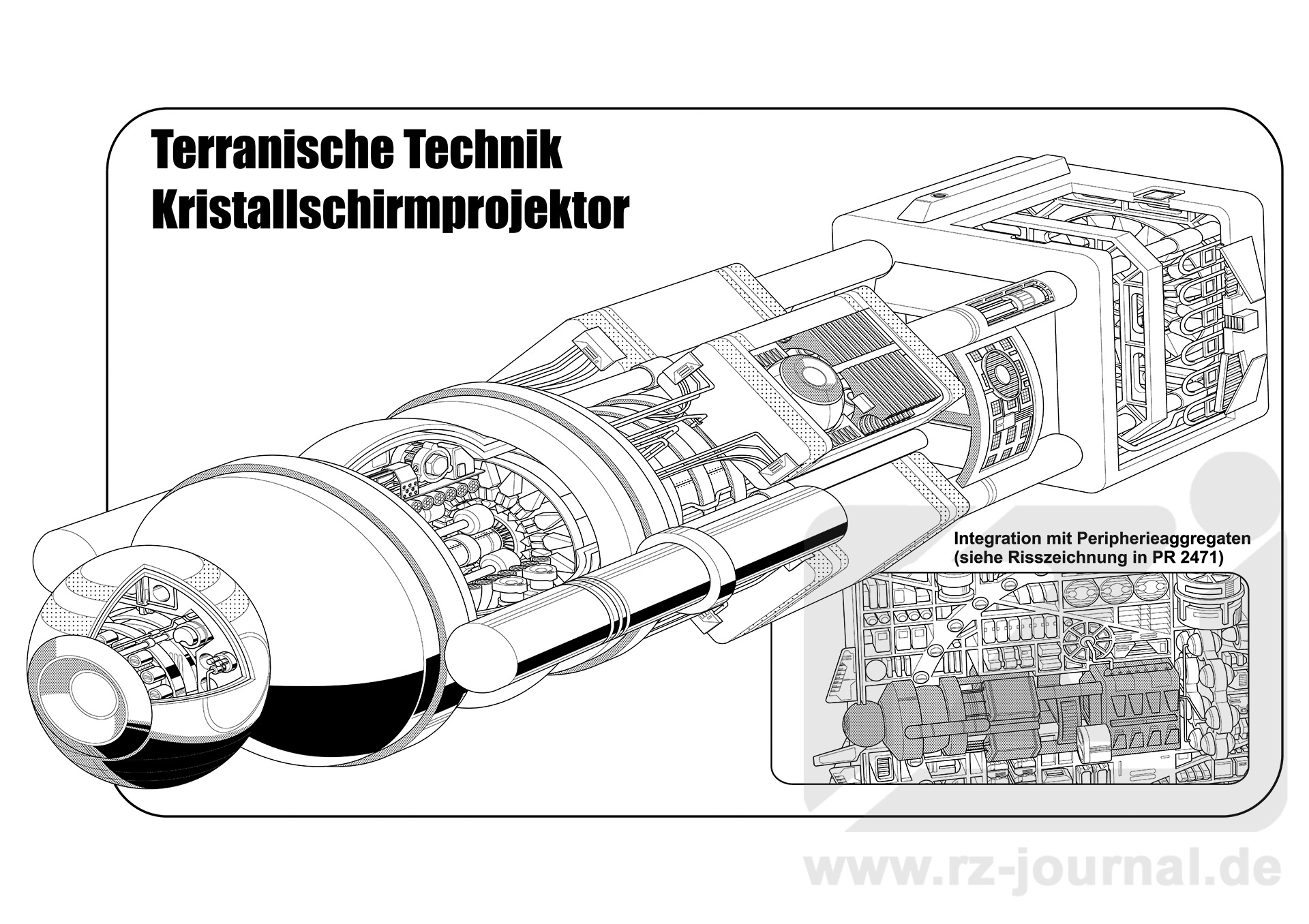 Prozessablauf: Zum Einsatz kommen je 38 Projektoren auf speziell für diesen Zweck konzipierten Tendern, den sogenannten LORETTA-Tendern (siehe Risszeichnung PR 2471). Hypertron-Sonnenzapfung versorgt die knapp 850 Meter langen und 200 Meter durchmessenden Aggregate mit Energie, deren Umwandlung in einem Ouintatron-Komplex erfolgt. Vom Quintatronring mit insgesamt 16 halbkugelförmigen, im Kern aus HS-Howalgonium bestehenden Injektor- und Wandeleinheiten wird die erzeugte multifrequente Hyperstrahlungin den Generatorblock des Projektors weitergeleitet. Ein Kugel-Resonator mit der Kernzelle des Hauptwandlers aus HS-Howalgonium und Salkrit ist mit der modularen Energiematrix des Generators verbunden und erzeugt multifrequente . Impulse. Diese werden über doppelwandige Verbindungshohlleiter in die primären und sekundären Mo- . dulatorblöcke geleitet. Ein zylindrischer Impulskollektor ist der Verstärkerstufe vorgeschaltet und durch zwei Energie-Überflutungssicherungen geschützt. Die Zentralleitung für die nun fokussierten multifrequenten hyperenergetischen Anregungsimpulse ist umgeben von einer Verstärkermatrix auf Salkrit-Basis, Verstärkerspulen sowie einer Rotationsärray zur weiteren Bündelung. Der 135 Meter durchmessende kugelförmige Hauptprojektorkopf beinhaltet Generatoren für Energiefeldlinsen (in Anlehnung an optische Verfahren wird hierbei von einer hyperenergetischen Polarisation gesprochen] und die abschließende Abstrahlmündung. Ober- und unterhalb des Projektorkopfs befinden sich Projektorleitwerke zurAnregungsimpuls-Feinvektorierung. |