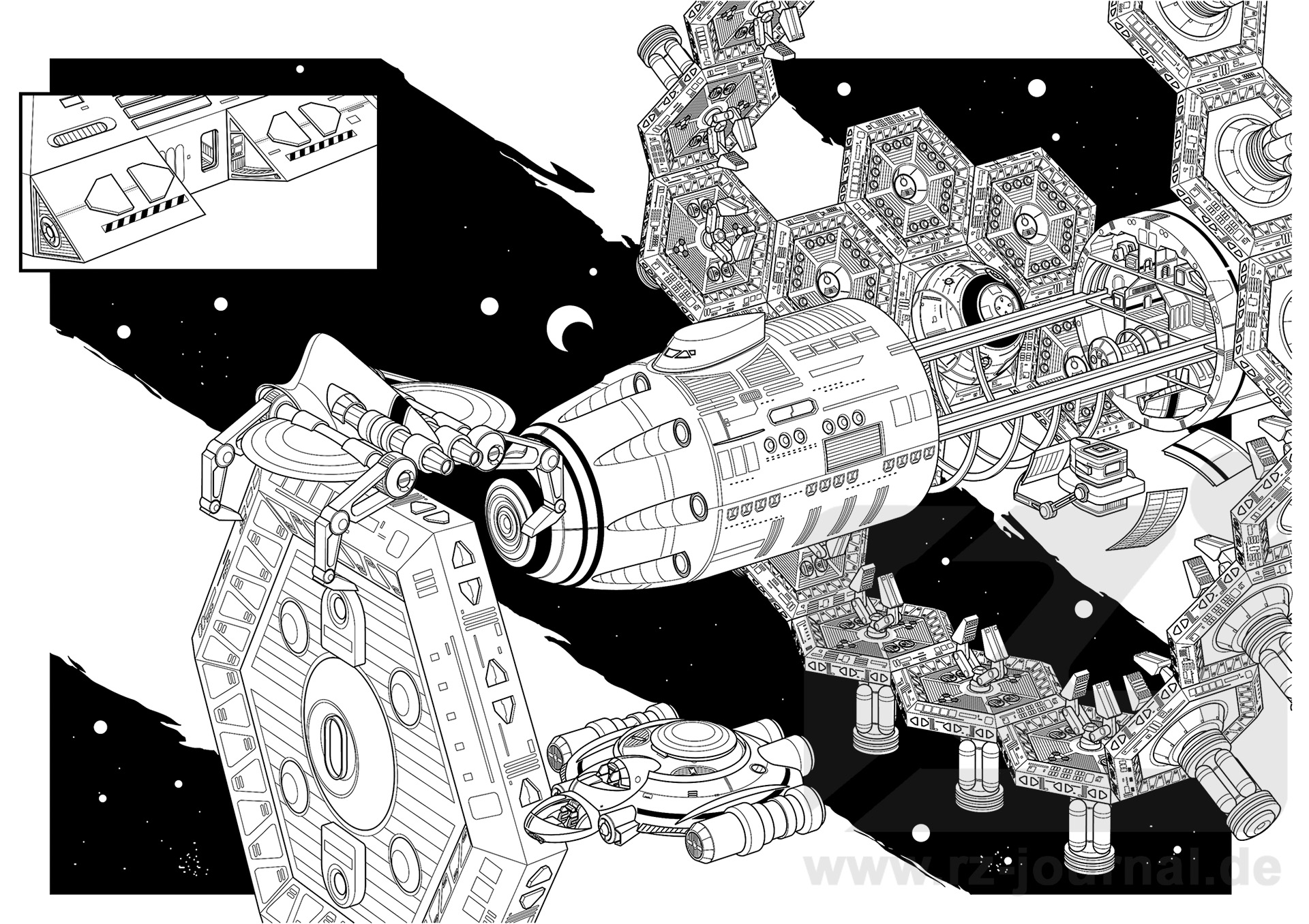 Legende: Wie im ersten Teil (siehe PERRY RHODAN-Report 425/2508) erklärt, gibt es verschiedene DEIMOS-Inseln für speziell definierte Aufgaben. In diesem Teil über die modularen Raumstationen der DEIMOS-Klasse beleuchten wir die Montagering-Konfiguration. Um den Wiederaufbau der Infrastruktur in der Milchstraße nach dem Terror-Regime der Terminalen Kolonne TRAITOR zu gewährleisten wurde teilweise auch auf das DEIMOS-System zurückgegriffen. Die Besonderheit hier ist, dass die Inseln nicht flächig aneinander zu koppeln, sondern einen sogenannten Montagering zu erzeugen. Über Fesselfelder wird das zu reparierende Raumschiff statisch zur Station fixiert. Die Reparatur erfolgt hauptsächlich über Reparatur-Bots und Einsatzteams. In dem hier dargestellten Beispiel sehen wir einen Montagering aus 18 Inseln und die daran angekoppelte DEIMOS-Klasse, sowie deren Versorgungsinseln. Die hier aufgeführte Montage-Station ist die kleinstmögliche Konfiguration. Denkbar sind auch immens große Ringe, sowie ganze miteinander verbundene Ringe, die in dem Fall als Weltraumdocks fungieren. Um die Montage-Inseln in der entsprechenden Art aneinander zu koppeln war es nötig Zwischenmodule zu entwerfen, die aus Prismen mit dementsprechenden Kopplungsaggregaten und vektorisierten Gängen besteht um von einem Modul in das nächste zu wechseln (kleine Grafik oben links). Unten Links dargestellt ist ein Inselschlepper der BIG-BUG-Klasse sowie ein patrouillierender 2-Mann-Jäger der HALLEY-Klasse.
