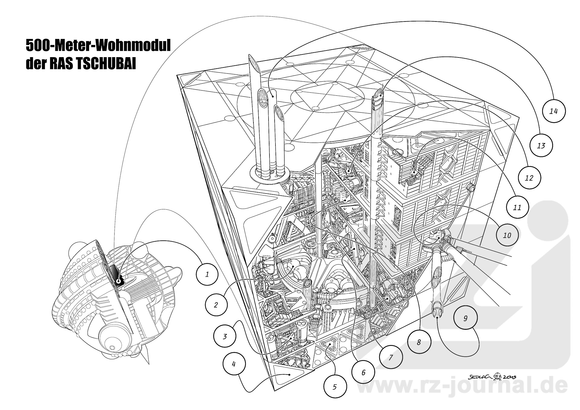 Die RAS TSCHUBAI als Perry Rhodans neues Fernraumschiff ist so einzigartig, wie zu ihren Zeiten die legendären terranischen Flaggschiffe MARCO POLO, SOL oder BASIS. Dieser Prototyp der damit neu etablierten SUPERNOVA-Klasse als Omniträger-Fernschiff für den multiplen Einsatz wurde dabei mit vielen neu entwickelten und zum Teil einzigartigen Technologien ausgerüstet. Dazu gehört auch die Konzentration der Unterkünfte für die – ohne die Posbis – bis zu 40.000 Personen starke Besatzung in einem speziell gesicherten autarken 500-Meter-Würfelmodul im Schiffsinneren. Inspiriert von den ARCHEN des Typs II, die im Stardust-System der »Fernen Lande« zum Einsatz kamen, ist dieses Wohnmodul der RAS TSCHUBAI zur Not weltraumtauglich. Es baut auf einem eigenen raumflugtauglichen Basisrahmen auf und verfügt über eine autarke Energieversorgung sowie Gravotron-Feldtriebwerke für den Unterlichtraumflug. Die Decksaufeilung in fünf Hauptebenen von jeweils 100 Meter lichter Höhe folgt dabei dem Grundaufbau der Kugelzelle des Mutterschiffs, ebenso wie die im Normalzustand nahtlose Integration der zwei innersten Hauptringachsen der Antigravschächte. |