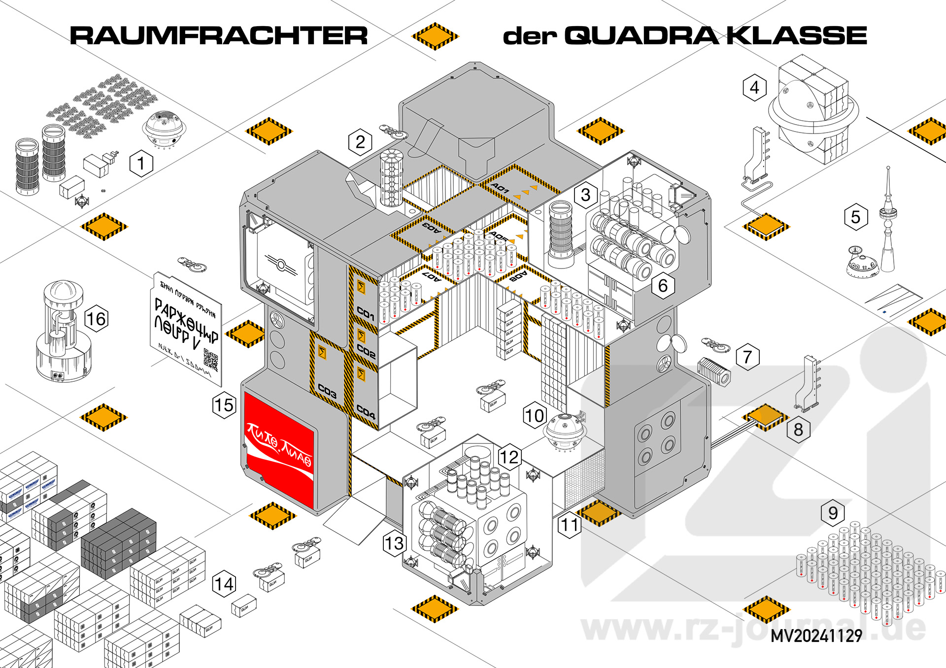 Allgemeines: Einheiten dieser zivilen Raumschiffsklasse sind als kommerzielle Raumer auf kostengünstigen Betrieb bei reduzierter Leistung ausgelegt. Ihre Vorgeschichte reicht bis in die Zeit kurz nach der Hyperimpedanz-Erhöhung zurück. Damals wurden die Raumer als voll robotisierte Modul-BOXENTyp »Kompakt-Kurzstrecken-Raumschiff« (KKS) als Ergänzung für die LFT-BOXEN der QUASAR-Klasse entworfen - Wegwerf-Raumschiffe, die schnell nachgebaut werden konnten. Wegen der Bedrohung zunächst durch das Atopische Tribunal und dann durch die Tiuphoren wurde die Produktion im 16. Jahrhundert NGZ hochgefahren, jedoch schlagartig wieder eingestellt, als beide Bedrohungen verschwanden. Als während des Weltenbrandes unzählige Raumschiffe zur Evakuierung benötigt wurden, reaktivierte man die Produktionsstätten, baute aber statt der militärischen Module Rachträume und Kabinen ein. Die dank Vorproduktion schnell vom Band laufenden Raumer erhielten die Bezeichnung QUADRA-Klasse. Tausende von ihnen kamen im Zug der Umsiedlungen zum Einsatz. Am Ende von Projekt Exodus wurden die Raumer auf dem Privatmarkt angeboten und erfreuten sich wegen ihrer Robustheit und der niedrigen Betriebskosten großer Beliebtheit bei Frachtunternehmen. Auch heute noch werden auf einigen LFG-Welten QUADRA-Raumer hergestellt, meist mit den ebenfalls auf Robustheit ausgelegten Elementen von Wylon Hypertech. Technische Daten Unterlichtantriebe: Antigrav-Feldtriebwerk, Beschleunigung: 45-90 km/s2 Librotronantrieb: Tewer-Il, Beschleunigung: 200 km/s2 (Notfall 450 km/s2) Überlichtantrieb:Tewer-II-Konverter, Überlichtfaktor: 1-5 Mio.; Etappenreichweite (8 Konverter): 5000 Lichtjahre, Gesamtreichweite 800.000 Lichtjahre Notfall-Transitionstriebwerk: Reichweite maximal 1,7 Lichtjahre Energieversorgung: max. 16 Daellian-Konverter (modular), 64 Fusionskraftwerke Defensiv: gravomechanischer und lonisations-Prallschirm, optional HÜ-Schirm anstelle eines Daellian-Meilers, optional Paratronschirm, wenn ein Tewer-Konverter durch Paratron-Konverter ersetzt wird; Librodrohnen, optional ein Librationstarner Offensiv: Sublicht-MVH |