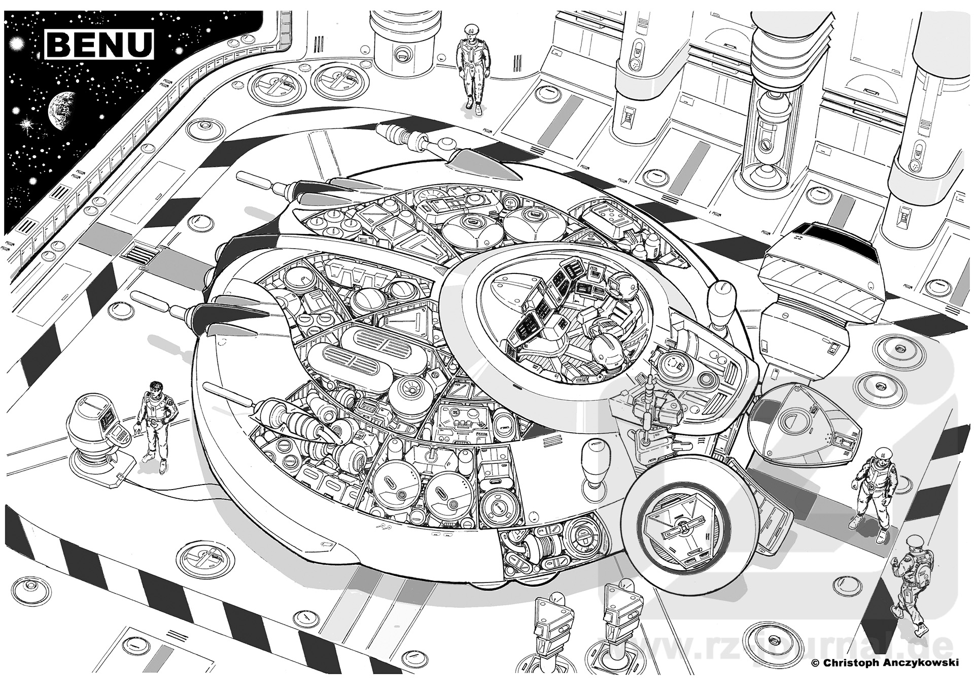 Allgemeines: Der kleine Bruder des PHOENIX - Christoph Anczykowski präsentiert das Beiboot BENU. Bei der Entwicklung des PHOENIX waren der Unterlichtflug und eventuelle Landungen kein Thema. Schließlich sollte dieser Schiffstyp nur zwischen an den äußersten Rändern der Galaxienhalos liegenden San-Höfen verkehren. Mit der Reise zur Agolei änderte sich jedoch die Prämisse für den PHOENIX selbst, und es wurde Platz für ein Beiboot geschaffen. Die Wahl fiel aufgrund des verfügbaren Raumes auf eine Space-Jet der SIGA-Klasse. Bei der Ausstattung wurde allerdings nicht auf die drei Standardpakete zurückgegriffen, da diese für das Zusammenspiel mit einer Flotte ausgelegt sind. Stattdessen wurde ein Mittelweg samt ankoppelbarem Zusatzaggregat gewählt. Um das umzusetzen, war noch Entwicklungsarbeit nötig, für die man nicht viel Zeit hatte. Dr. Liam Barstow gewann dafür den höchst erfahrenen Leitenden Flotteningenieur Christoph Anczykowski, der das Projekt erfolgreich von der Konzeption bis zur Fertigstellung ohne Verzögerungen durchzog. Möglich war dies unter anderem aufgrund der hervorragenden Visualisierungen, mittels derer alle Beteiligten an dem Projekt stets vor Augen hatten, was das Endziel war. Eine der dabei entstandenen Übersichtsrisszeichnungen gaben die Verantwortlichen im Projekt von San auf vielfältige Bitten hin zur Veröffentlichung frei. |