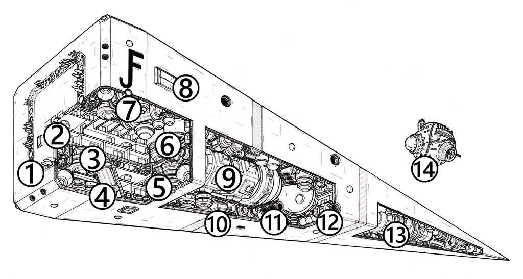 Allgemeines: Die Gravitationsbrecher sind spezielle Raumschiffe, mit denen die Leun sich im Bereich um die GRAVEN-Stationen relativ gefahrlos fortbewegen können. Die GRAVEN-Stationen sorgen für die Stabilität des Sternenwürfels; dazu sind sie mit großen Anlagen zur Gravitationsgenerierung und -negierung ausgerüstet. Das hat zur Folge, dass im direkten Umfeld der GRAVEN-Stationen extrem schwankende Schwerkraftgewalten die Stabilität aller hineingeratenen Objekte gefährden und die Navigation erschweren. Die Gravitationsbrecher sind speziell ausgerüstete Schiffe, mit sehr leistungsfähigen Schutzschirmen, Antigrav-Generatoren, Andruckabsorbern und dergleichen. Sie sind rund 200 Meter lang und am Bug etwa 40 Meter breit, bei einer zum Heck spitz zulaufenden Keilform. Gravitationsbrecher werden in leicht unterschiedlichen Varianten gebaut, abhängig davon, ob sie mehr der Beförderung von Passagieren oder von Fracht dienen. Alle wichtigen Aggregate sind mehrfach redundant verbaut, da der Flug in der Gravozone auch für die Gravitationsbrecher nicht ungefährlich ist. Sie sind in den Hangars der Steuermonde der GRAVEN-Stationen untergebracht. Diese künstliche Monde befinden sich am Rand der gefährlichen Gravozone und können von normalen Raumschiffen gefahrlos angeflogen werden. |